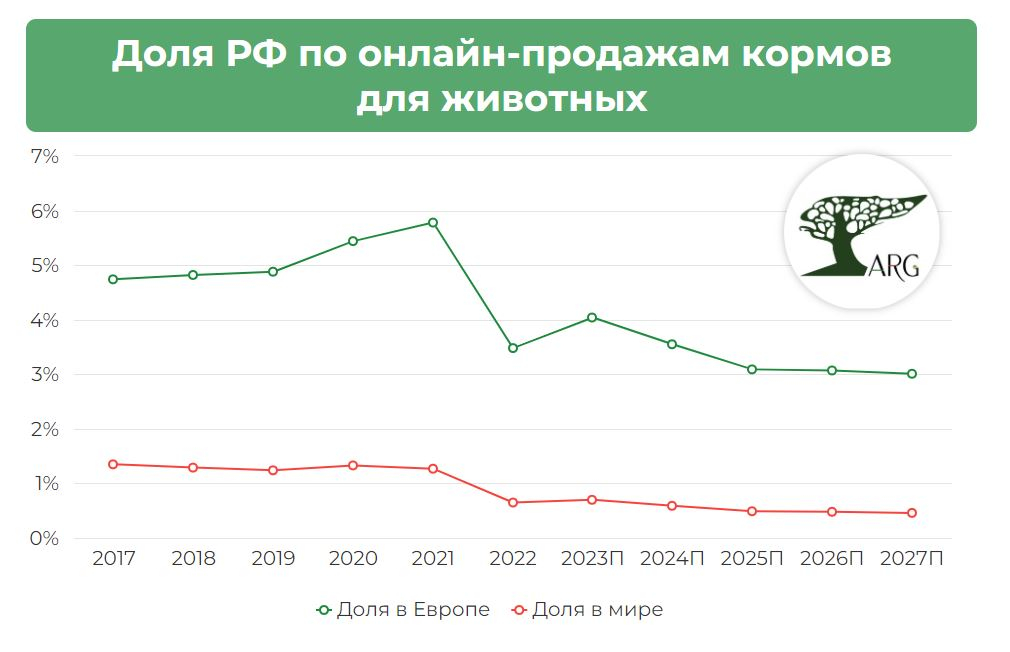 Несмотря на прогнозы, согласно которым онлайн-продажи в РФ будут расти медленнее, чем на европейском и мировом рынках, ожидается, что объем онлайн-продаж кормов в России продемонстрирует существенные темпы роста в период до 2027 года (+19,16% ежегодно), в результате чего прогнозируемый объем рынка к 2027 году составит 49,5 млн. долл.