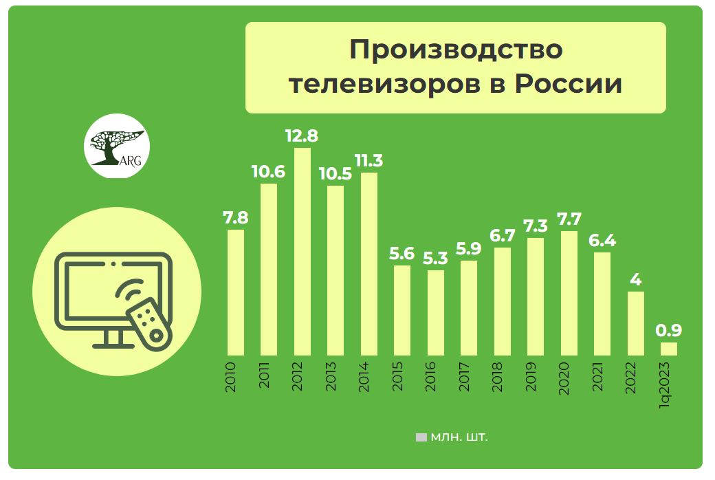 Официальная статистика подтверждает, что на рынке наблюдается спад производства. Объем выпуска телевизоров в России по итогам 2022 года составил 4 млн. шт.– это на 37,3% меньше, чем годом ранее. Для сравнения, в 2011-2014 годах Россия выпускала более 10 млн. телевизоров в год. В начале 2023 года темпы изменения рынка были сопоставимыми: в первом квартале объем выпуска телевизоров был на уровне 902,9 тыс. шт. (-38,2% YoY).