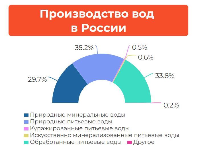 Наконец, меньшие доли (менее 1% от общего объема производства) приходятся на категории купажированных питьевых вод (они производятся путем смешивания природной минеральной и природной питьевой воды или только природной минеральной воды) и искусственно минерализованных питьевых вод (производятся на основе природной минеральной или природной питьевой воды с добавлением минеральных солей, также могут быть произведены при восстановлении минеральной соли природной минеральной воды с использованием питьевой воды).