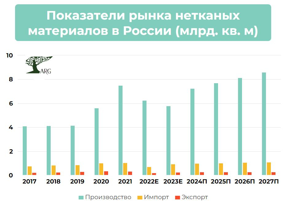 По оценкам «AnalyticResearchGroup», общий объем рынка нетканых материалов в России (объем видимого потребления: производство с учетом импорта за минусом экспорта) в натуральном выражении в 2022 году сократился на 18,1%, составив 6,7 млрд. кв. м. Рекордный рост рынка был характерен для 2020 и 2021 годов на фоне резкого роста спроса со стороны производителей гигиенических и медицинских изделий, связанного с пандемией COVID-19. Так, если в 2018-2019 годах рынок рос не более чем на 2% в год, в 2020 году прирост составлял около 33%, в 2021 году – 31%.