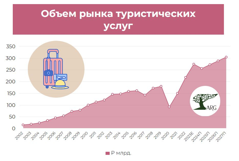 После потрясений 2020-2021 годов туристический рынок в России восстанавливается очень активными темпами. В 2022 году объем оказанных населению туристических услуг увеличился на рекордные 45%, достигнув значения 217,6 млрд. руб. Этот показатель более чем в два раза превышал значения, которые отрасль продемонстрировала в 2020 году. Ожидалось, что по итогам 2023 года рынок также покажет высокие темпы (рост более чем на 20% к результатам прошлого года) и продолжит наращивать обороты в дальнейшем, перевалив за отметку 300 млрд. рублей уже в 2027 году.
