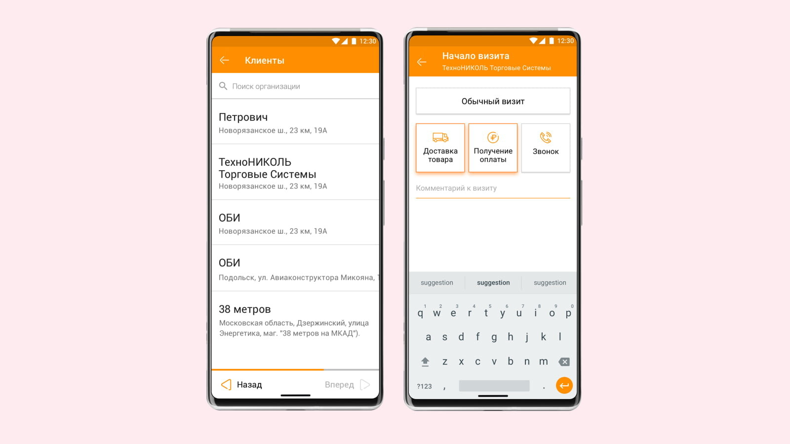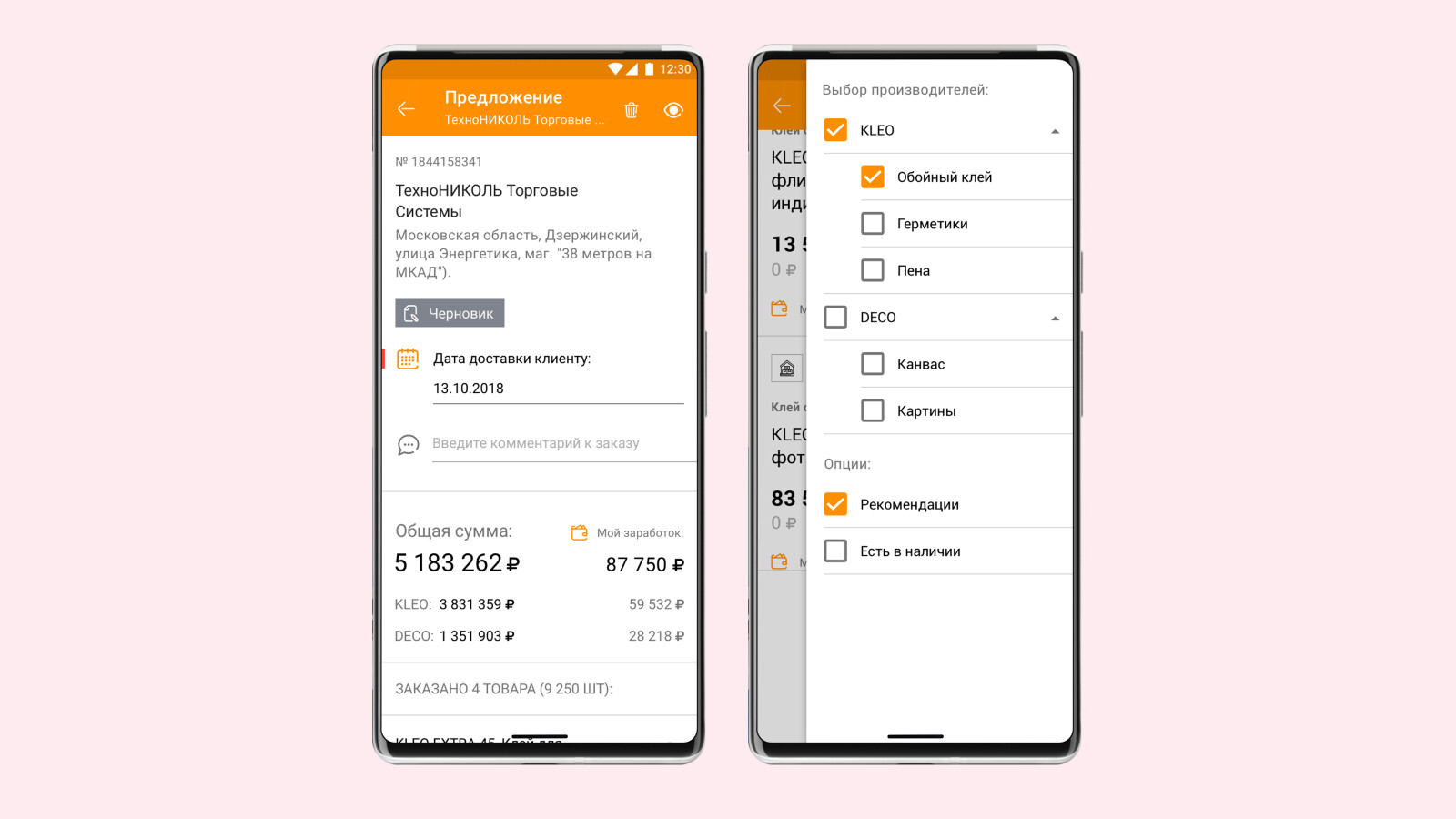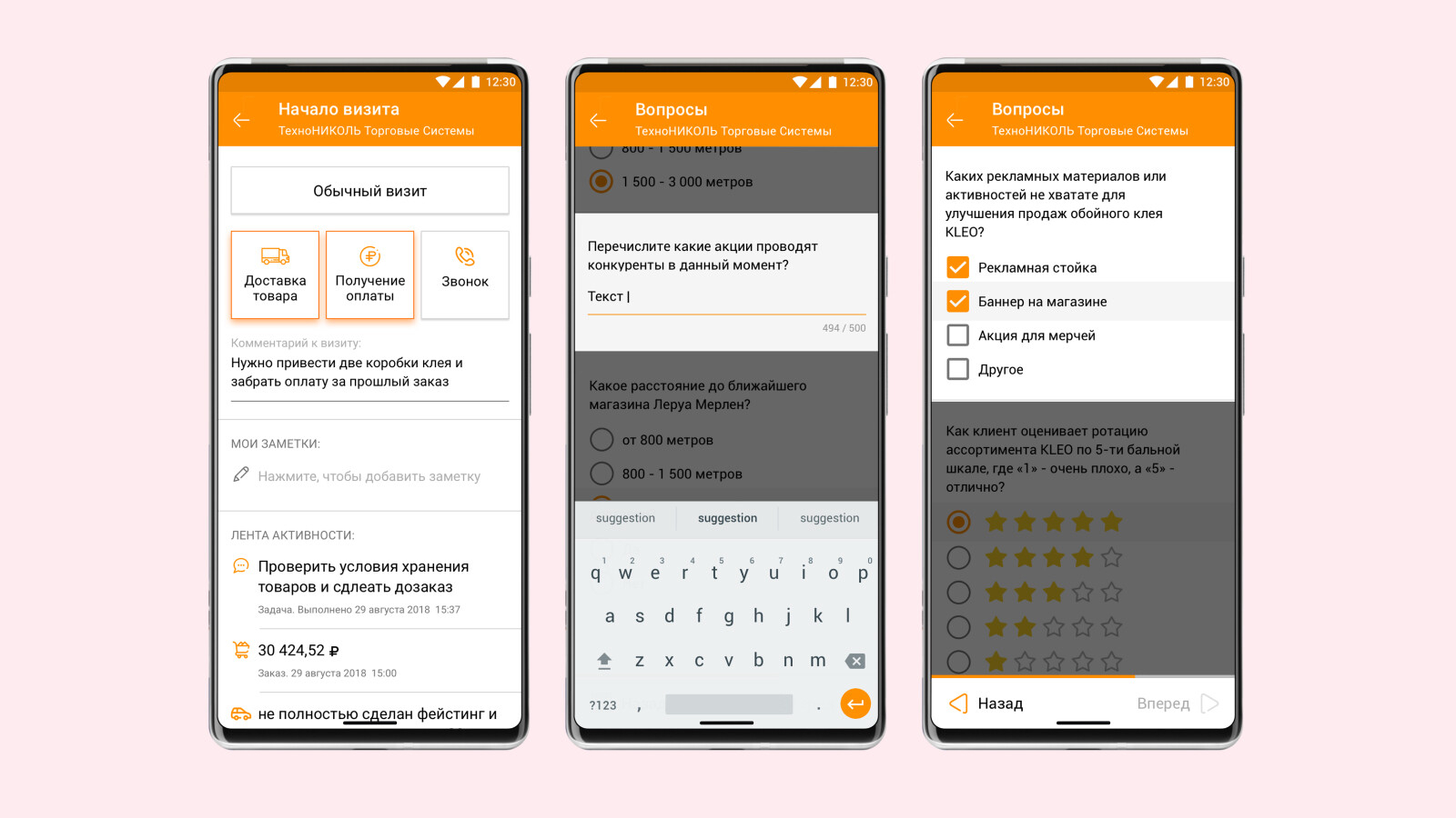 Стандартное окончание визита — заказ новых товаров. Сотрудник выбирает договор, нужные позиции, дату доставки и контактное лицо. На этом же экране торговый представитель видит свой процент от суммы заказа: чем больше товаров заказал клиент, тем больше денег заработал сотрудник.