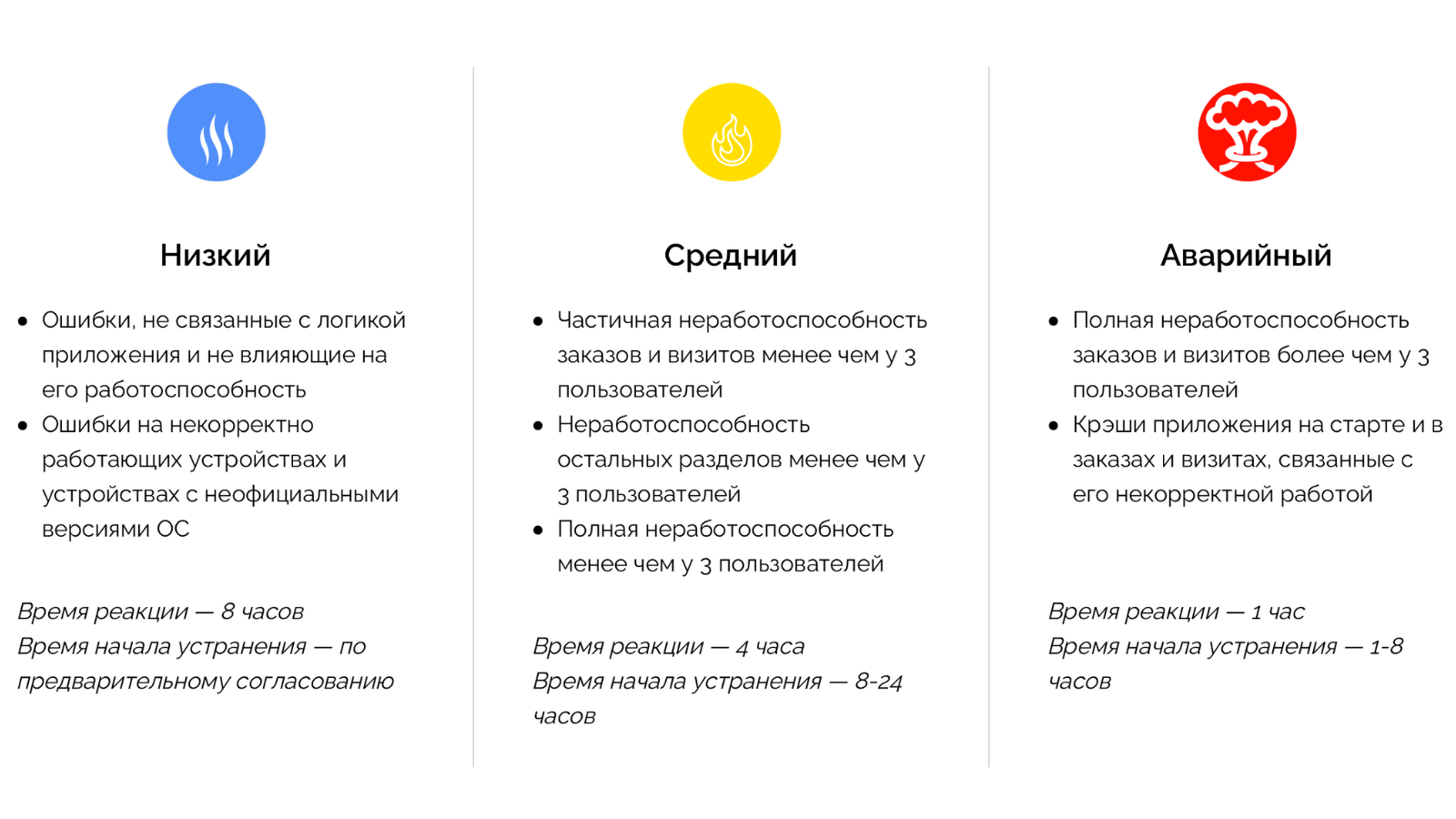 Мы договорились с Ascott, что ошибки в работе приложения делятся на уровни важности. Клиенту такое решение позволяет быть уверенным в том, что мы быстро приступим к изучению ошибки, если она критичная для работы приложения. Нам же градация дает возможность не начинать изучение мелких ошибок (тех, которые не влияют на основной флоу работы и не затрагивают многих менеджеров) сломя голову.