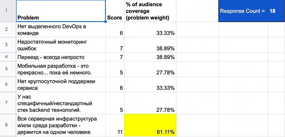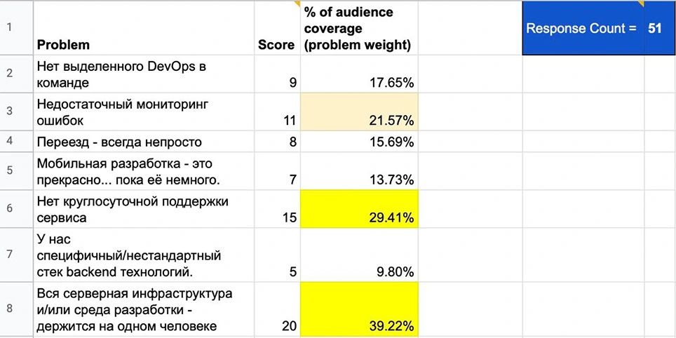 Мы просмотрели интервью и выписали все боли клиентов. Получился список из примерно 30 пунктов. Потом выбрали самые частые проблемы и те, которые мы уже решали. Каждому пункту поставили ранг приоритета для отбора в заключительный опрос. Опросили около 70 представителей аудитории, чтобы подтвердить гипотезы.