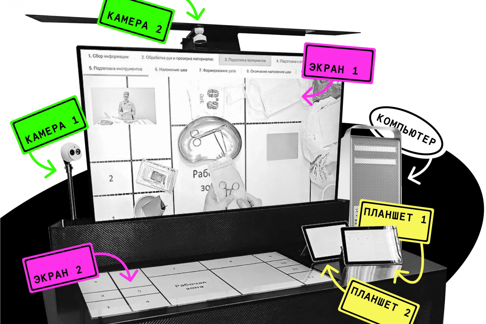 Внешне это выглядит как конструкция из двух IP-камер, планшетов студента и преподавателя и двух телевизоров: один расположен горизонтально, как стол, другой — закреплен перед студентом.