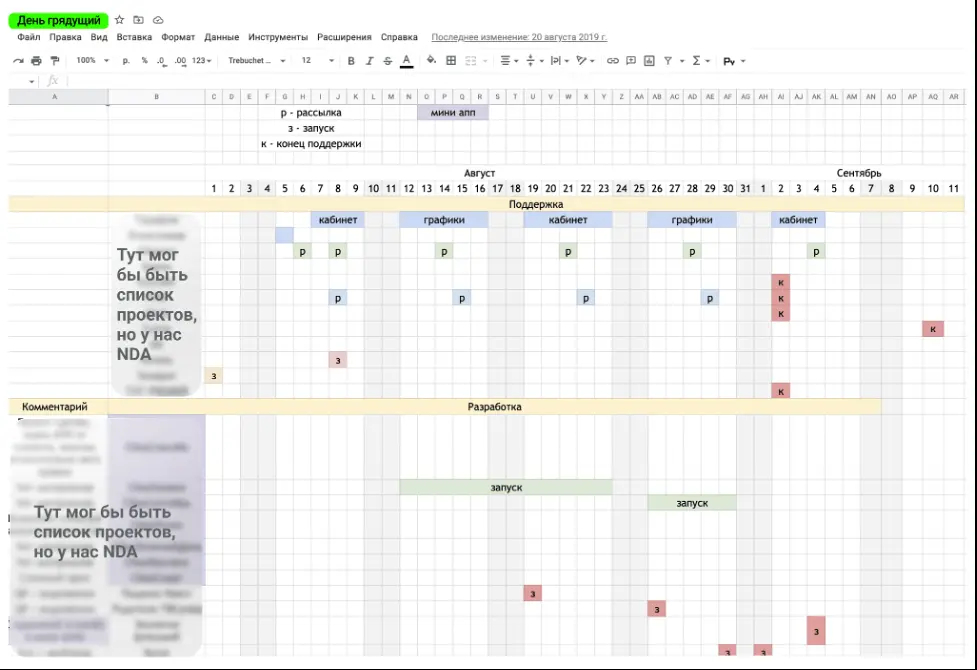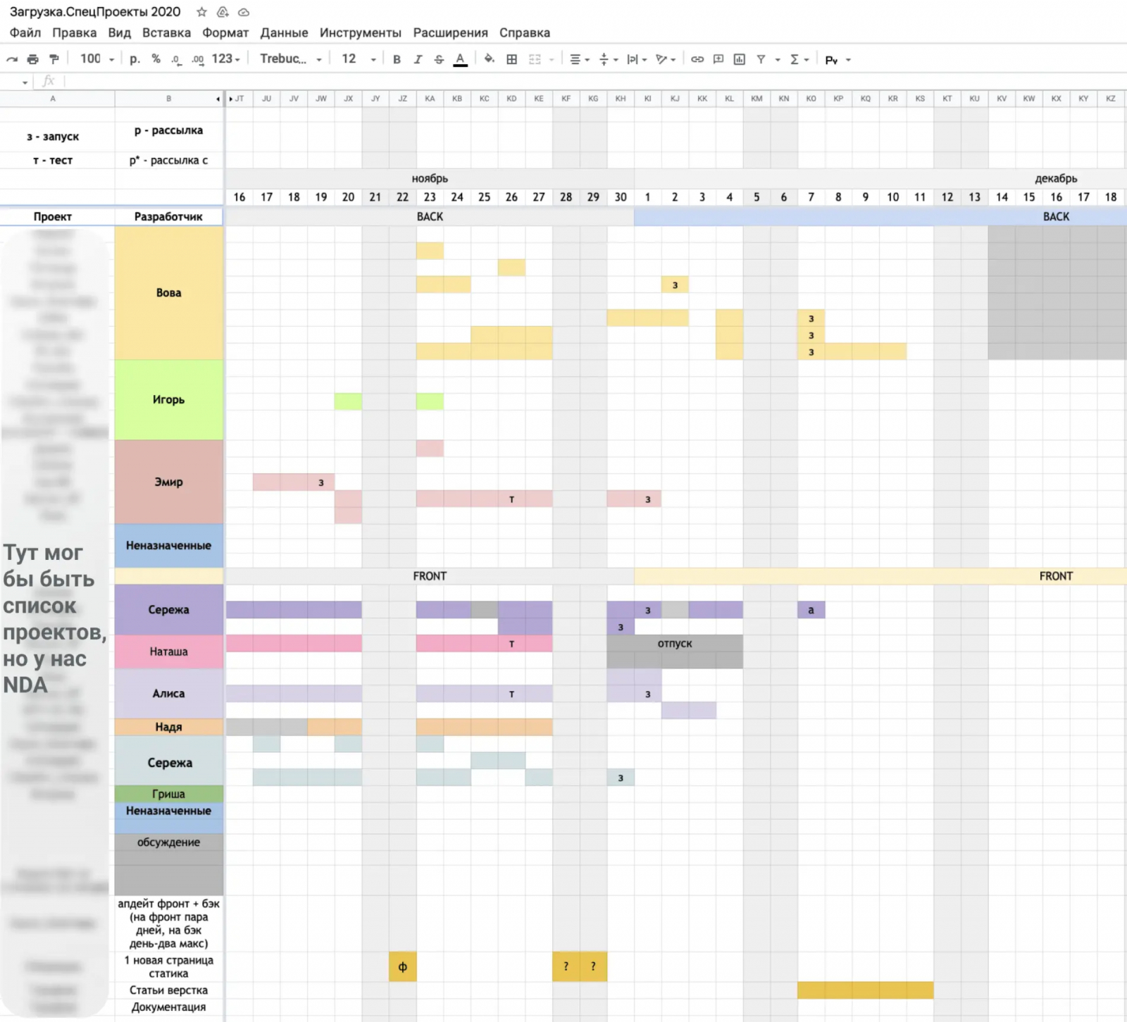 Это помогло, но не решило все проблемы планирования. Самым полезным в этой таблице было то, что мы стали заранее вносить проекты, которые могут подтвердиться.