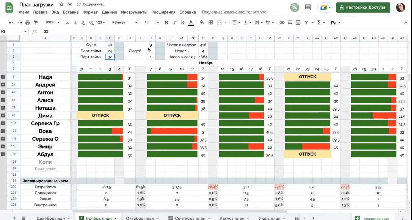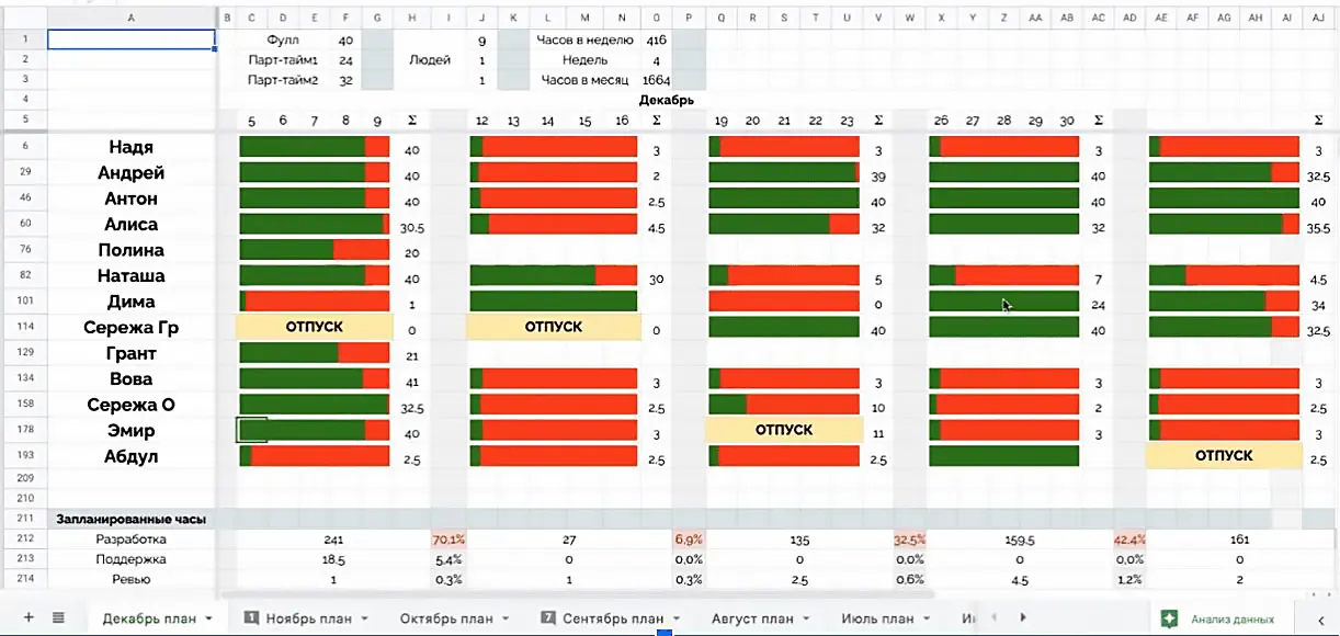 На картинке ниже видно, что мы освоили графики внутри ячеек и, что большинство ребят в отделе распланированы. Их запланированные часы суммируются и подсвечиваются зелёным внутри диаграммы. Красный остаток рассчитывается относительно рабочего времени, учитывая разный формат работ (фуллтайм/парттайм). Также, сразу видно сводную информацию по загрузке всего отдела, кто и когда идет в отпуск. Этот вид помогает быстро принять решение о подтверждении сроков для новых заявок и сверять соответствие бизнес-плану.