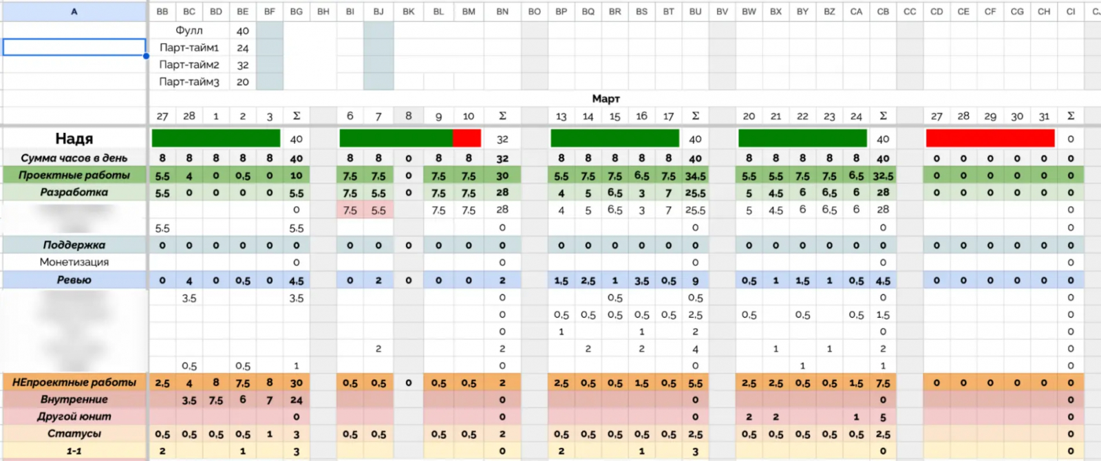 В развёрнутом виде представлена разбивка возможных типов задач по каждому отдельному разработчику. Все задачи разбиваются на проектные — это разработка, поддержка и ревью — и непроектные. К последним относится обновление статусов, менторские встречи и внутренние задачи по отделу.