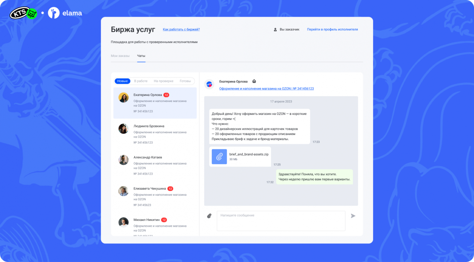 После отклика исполнителя с ним создаётся чат. Заказчик может обсудить детали заказа с откликнувшимися исполнителями и выбрать подходящего.