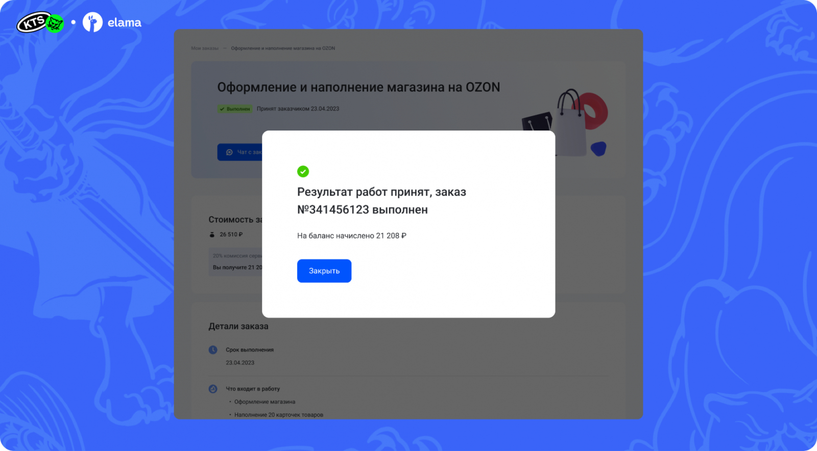 Когда задача выполнена, заказчик проверяет результат и утверждает его, если всё в порядке. После утверждения замороженные деньги с баланса заказчика переводятся на баланс исполнителя. Если заказ оформлен с закрывающими документами, дополнительно eLama высылает нужный комплект для бухгалтерии и налоговой.