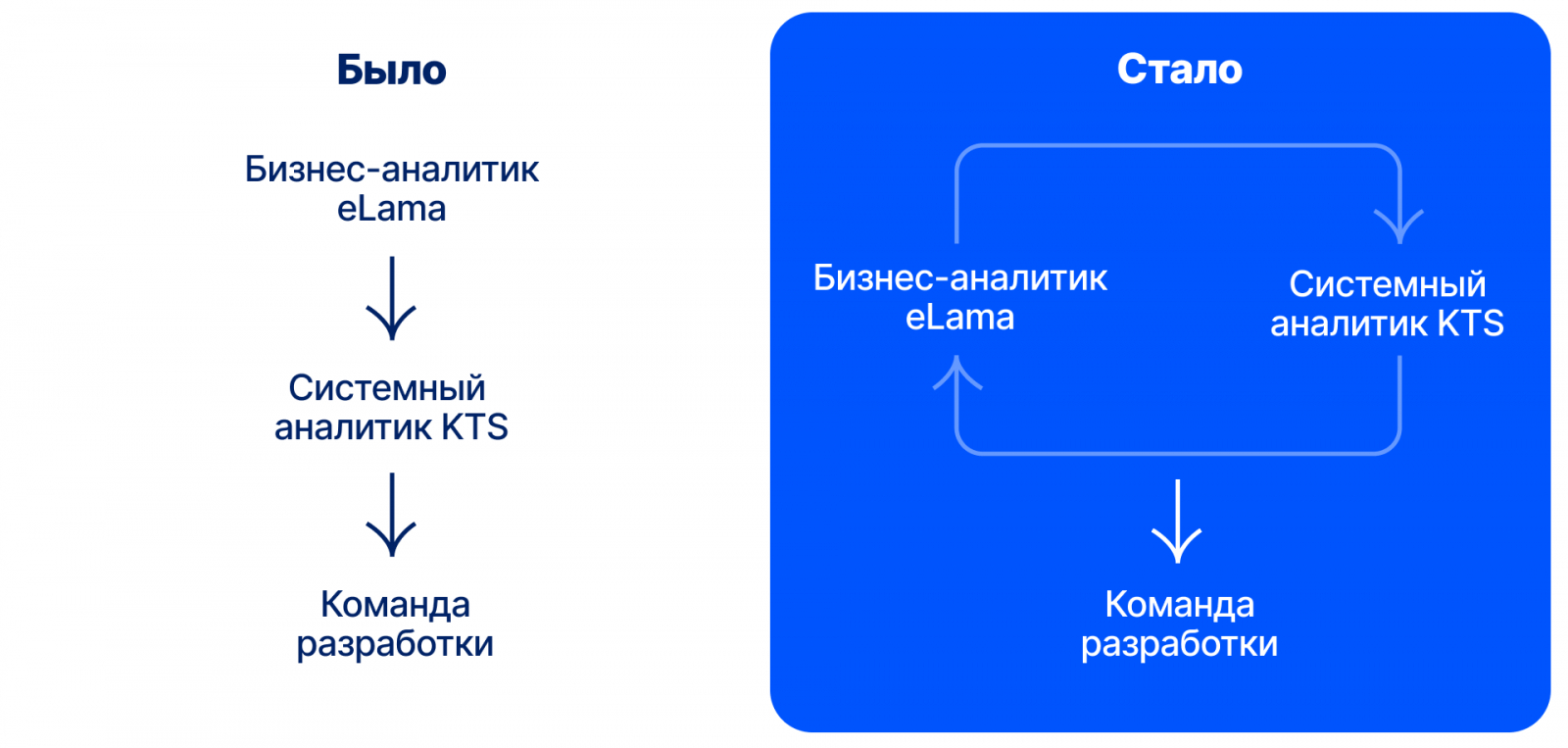 В начале разработки мы получали детально проработанные требования от бизнес-аналитика eLama, по которым достаточно было только технически проектировать сервис. При дальнейшей реализации более сложных фичей такая последовательная схема взаимодействия стала менее эффективной, поэтому мы перешли к гибридной команде.
