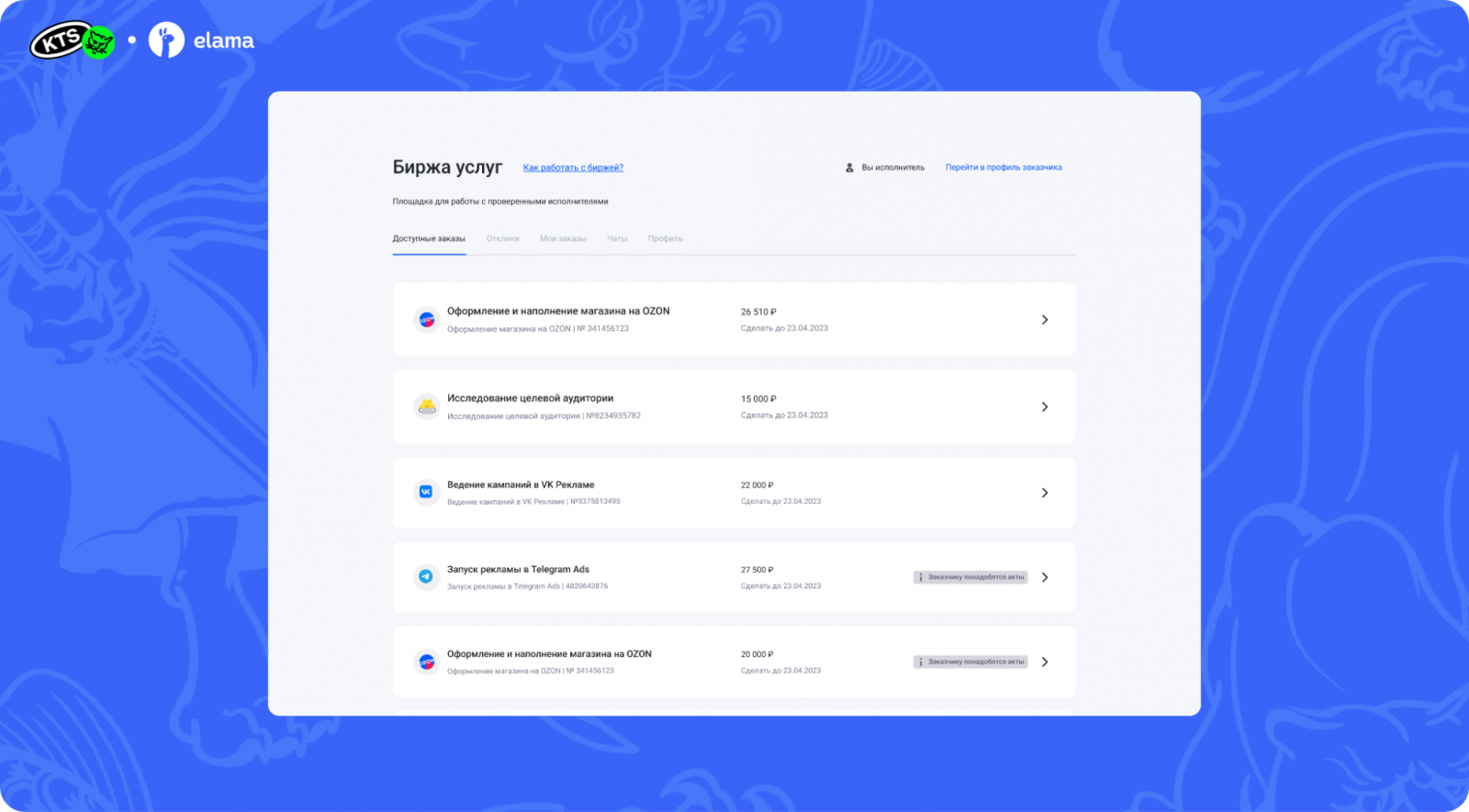 Исполнитель видит список доступных заказов. В описании к каждому заказу указаны: цена, дедлайн, требования к закрывающим актам и ожидаемый результат.
