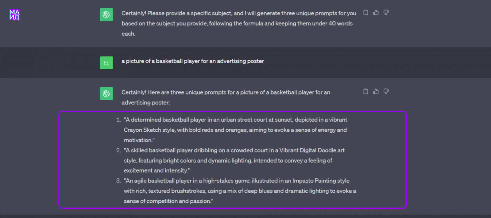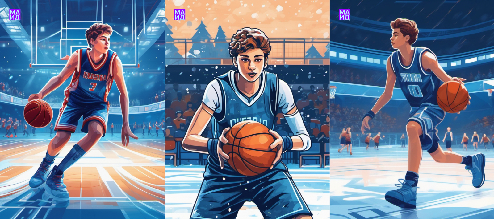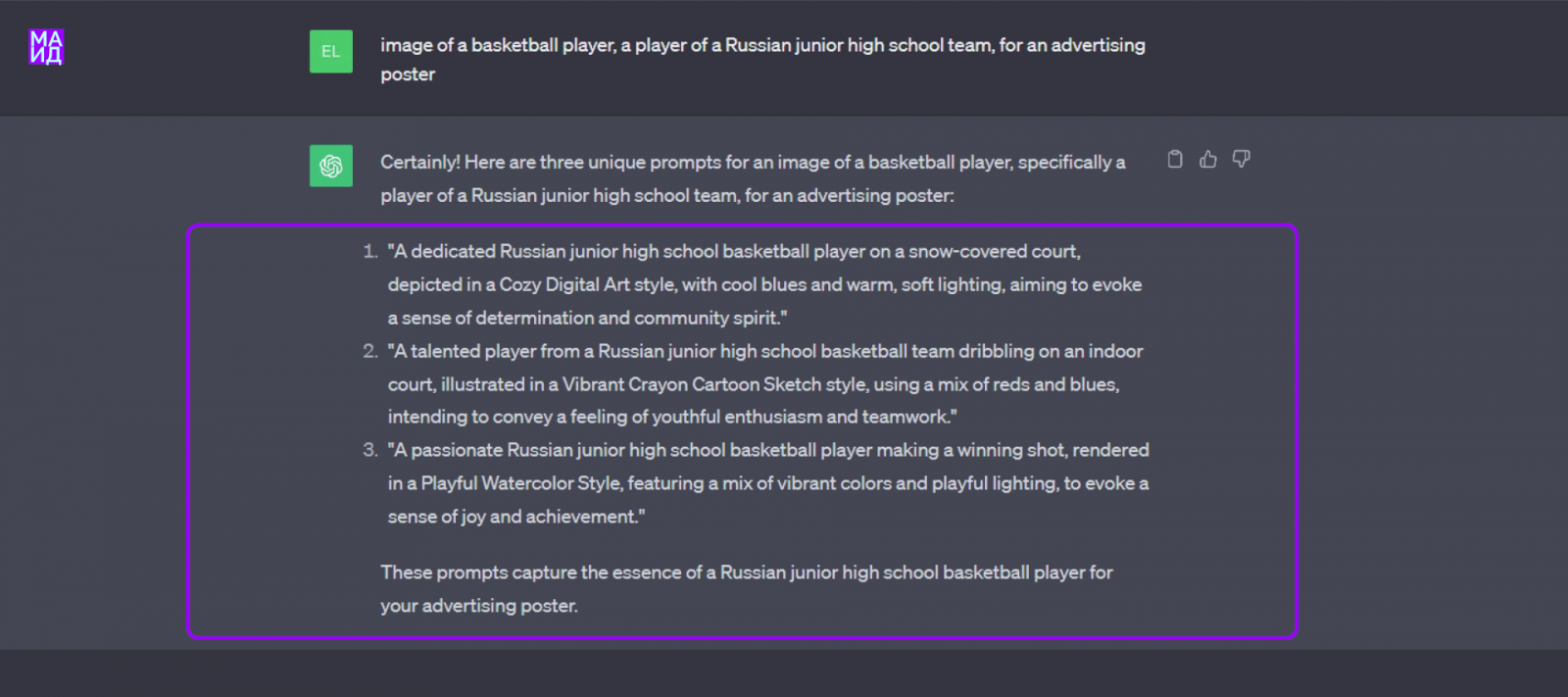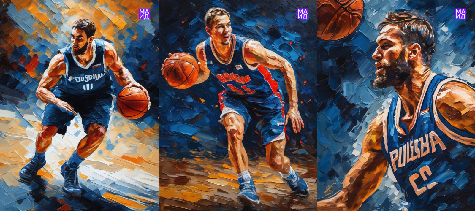 Вдохновляйтесь совместной работой двух нейросетей ChatGPT и Stable Diffusion XL, которые создают иллюстрации для школьной баскетбольной команды, после корректировки нашего первого запроса. Промпты пишет ChatGPT, по сгенерированным промптам магистранты создают изображения с нейросетью Stable Diffusion XL. Время профессиональной работы? В десятки, сотни раз меньше, если бы нам нужно было ставить техническое задание иллюстратору, а затем вносить правки.