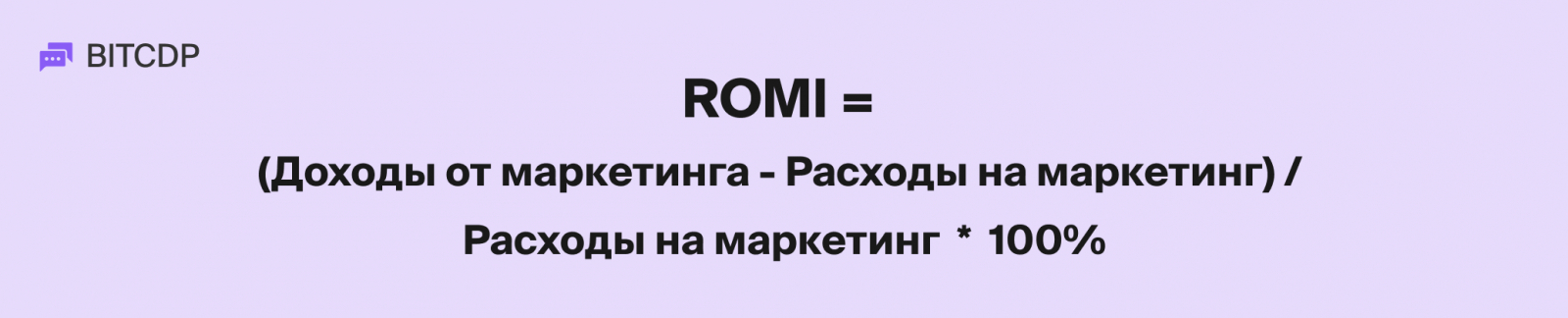 ROMI = (Доходы от маркетинга - Расходы на маркетинг)/ Расходы на маркетинг * 100%