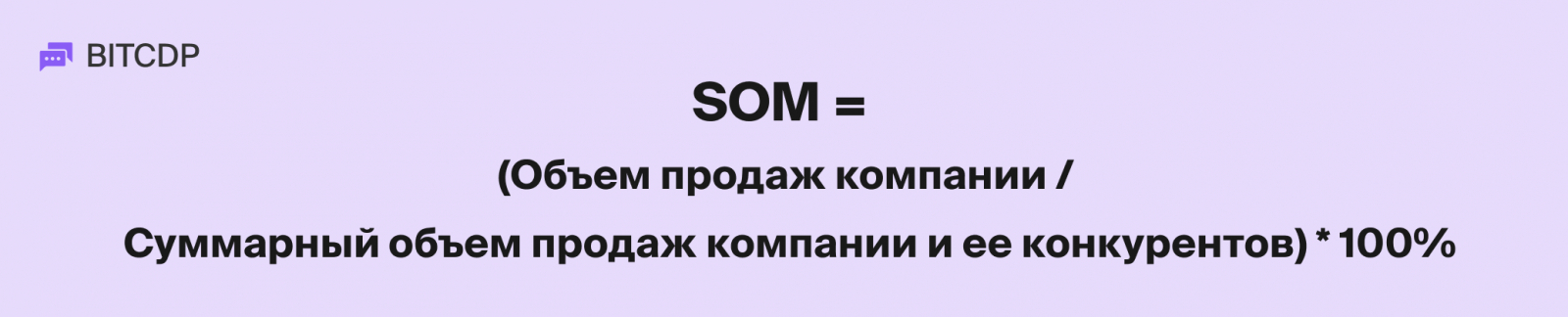 SOM = (Объем продаж компании / Суммарный объем продаж компании и ее конкурентов) * 100%