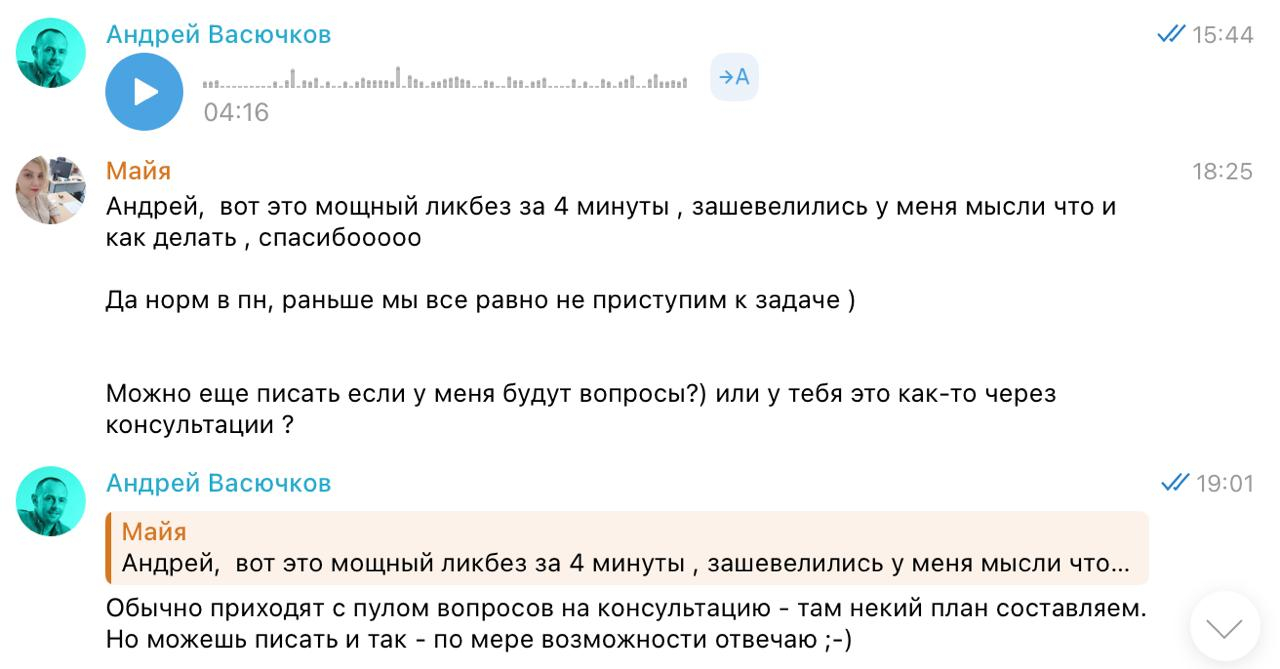 А потом пришла в личку за советом. За 4 минуты я ей рассказал один из механизмов увеличения показателей лидогенерации, отслеживания инкремента статистики и подход к работе с контекстом в B2B. И эти 4 минуты сподвигли ее начать делать что-то новое, ибо она получила объяснение и понимание.