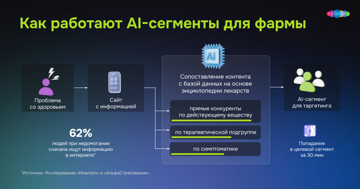 Для большинства задач в programmatic есть один почти универсальный ответ — более точный таргетинг. Так, например, в этом году Soloway представил аудиторные AI-сегменты для фармбрендов. В основе инструмента лежат продвинутые нейросетевые модели, которые: