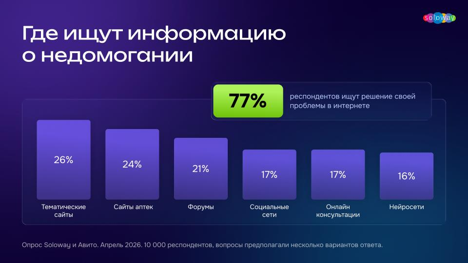 Так, 77% из 10 000 опрошенных сначала ищут информацию о недомогании в интернете. Тематические статьи, сайты аптек, форумы, соцсети, онлайн-консультации и нейросети — в топе ресурсов.