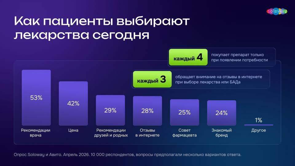 Со временем меняются не только рыночные условия, но и путь потребителя, то, как он принимает решение о покупке. Soloway и Авито Реклама провели опрос среди 10 000 респондентов и выяснили, как пациенты сегодня выбирают лекарства и БАДы.