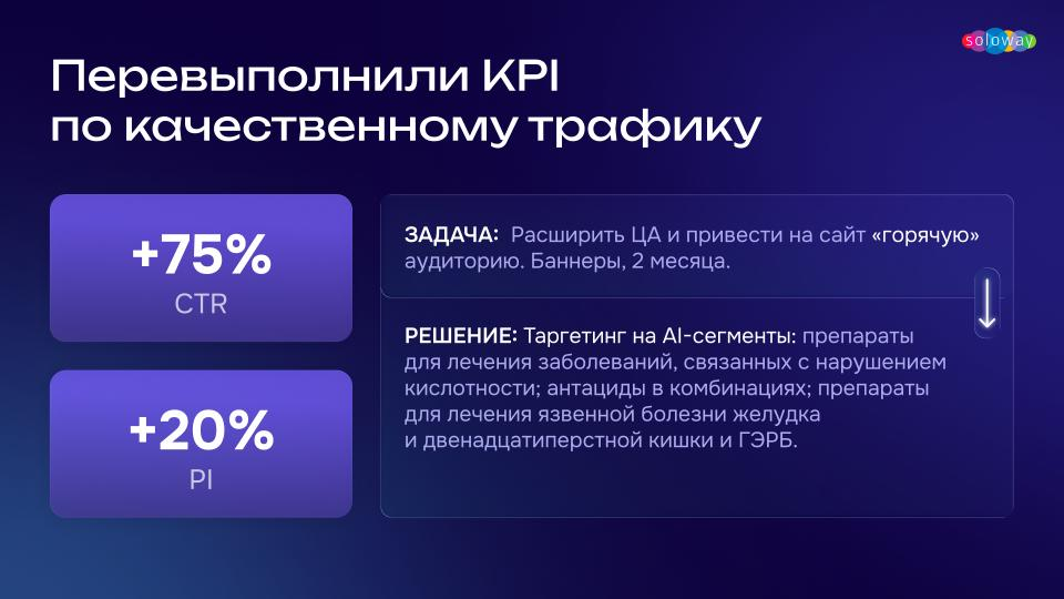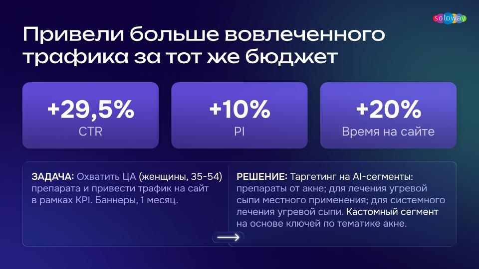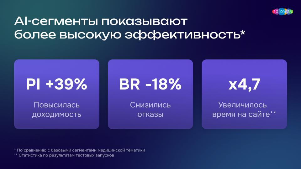 Чтобы решить проблему, нужно перейти от статичных портретов аудитории к анализу поведения в реальном времени. Так работают AI-сегменты Soloway для фармрынка. Они «угадывают» потребность в препарате ещё до того, как человек пошёл его искать, и добавляют его в целевой сегмент.
