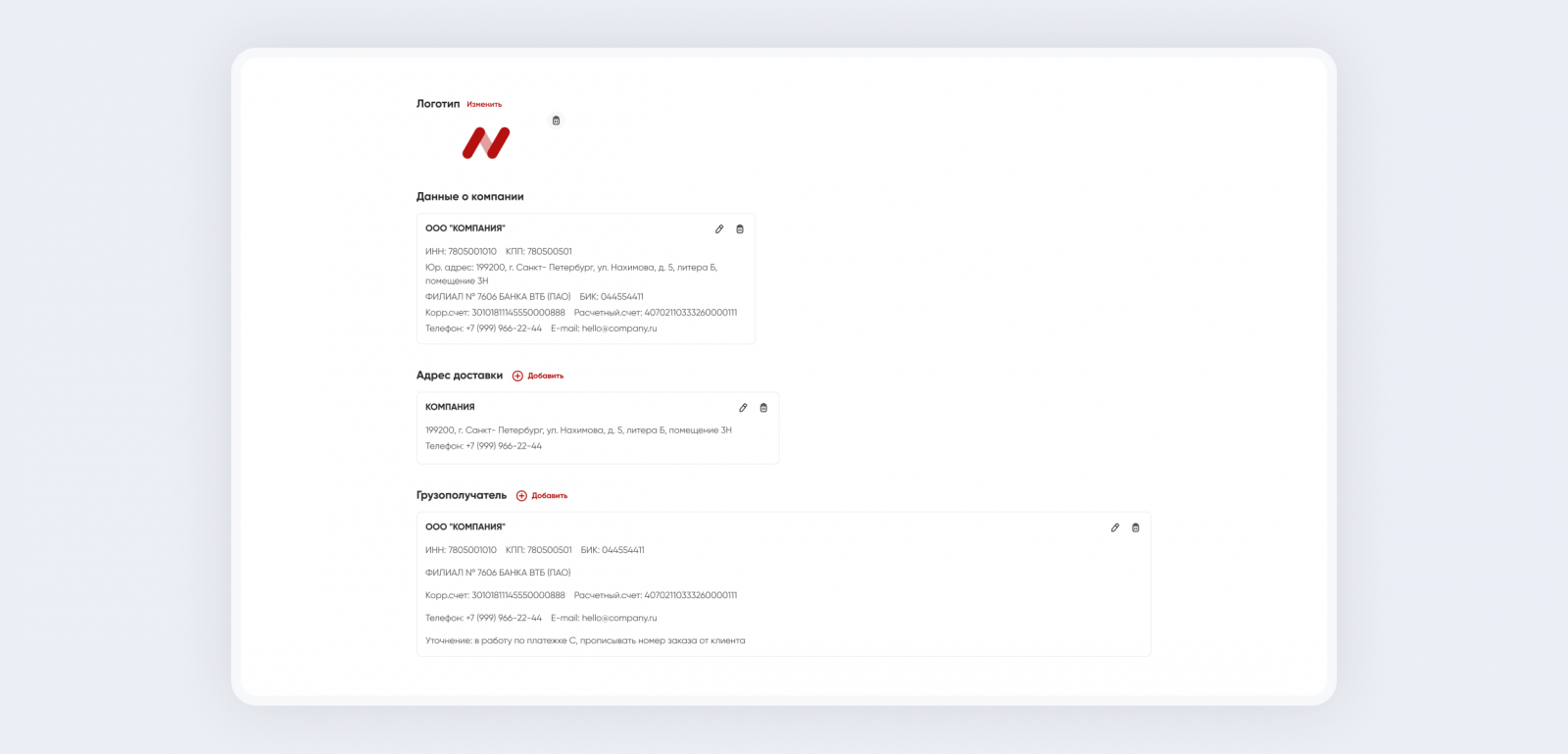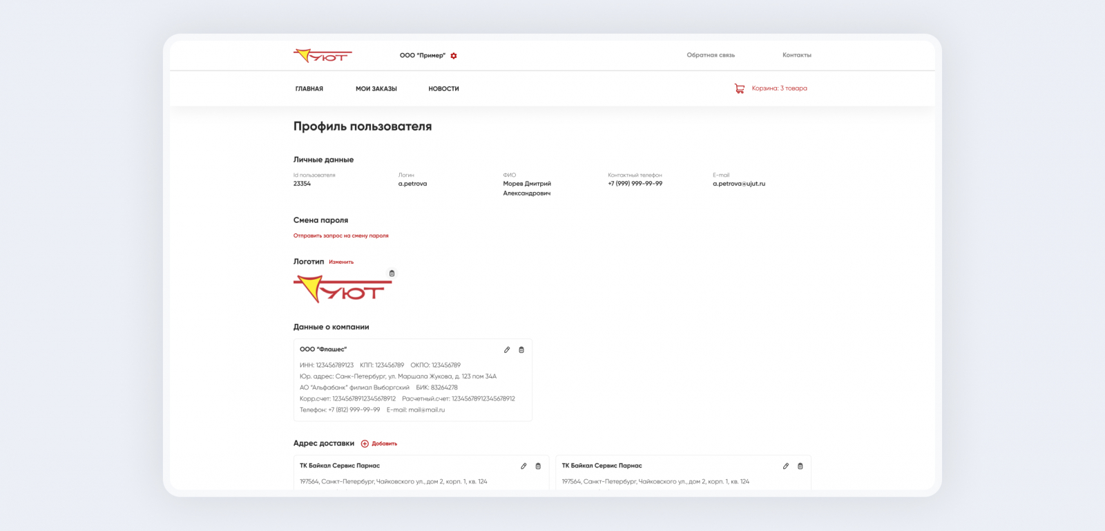 В профиль пользователя подтягиваются все данные: ID пользователя, его логин и ФИО, данные о компании, адрес доставки и данные грузополучателя.