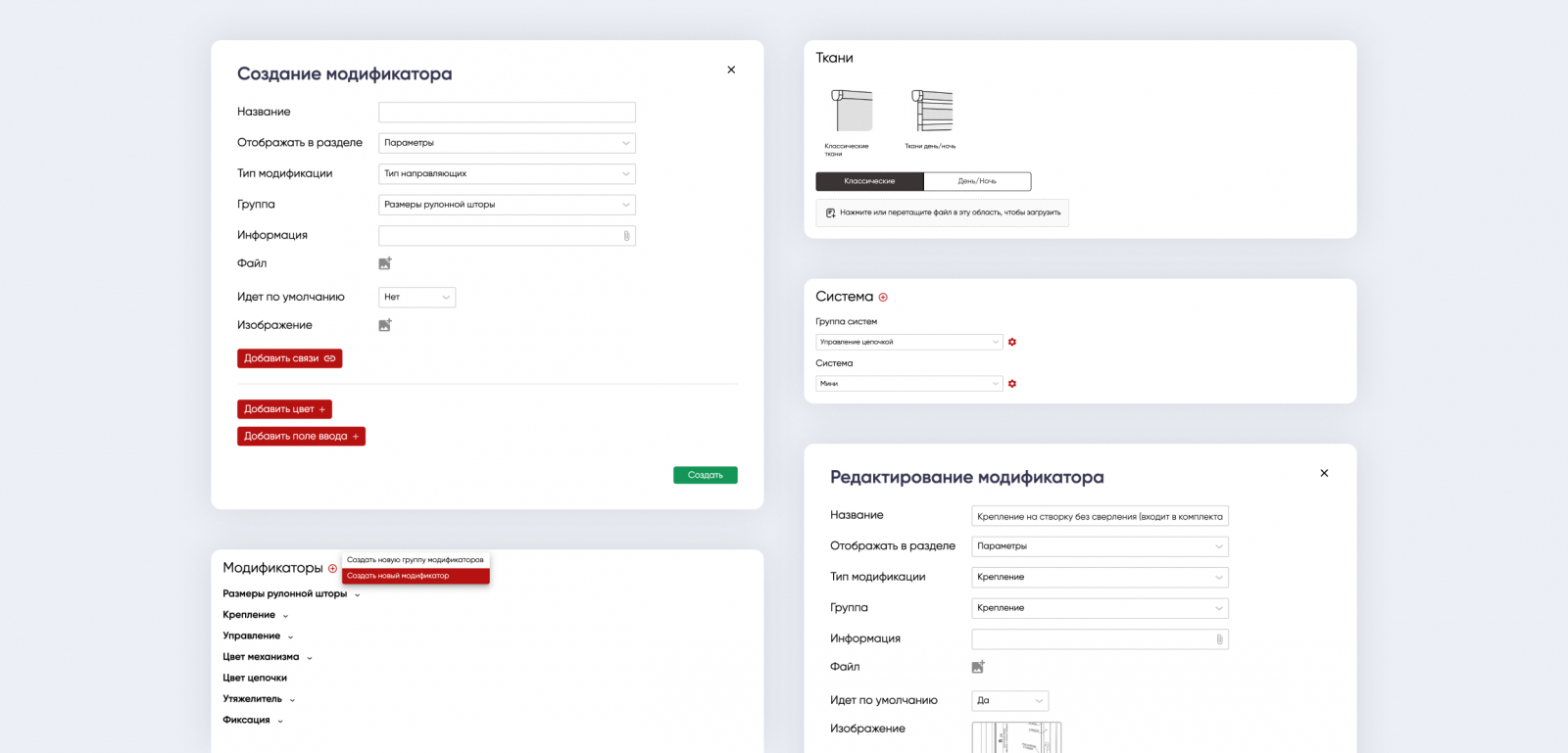Через админский кабинет можно настраивать все модификации товаров, которые выводятся на клиентскую часть конструктора: добавлять ткани и новые цвета, менять комплектацию.
