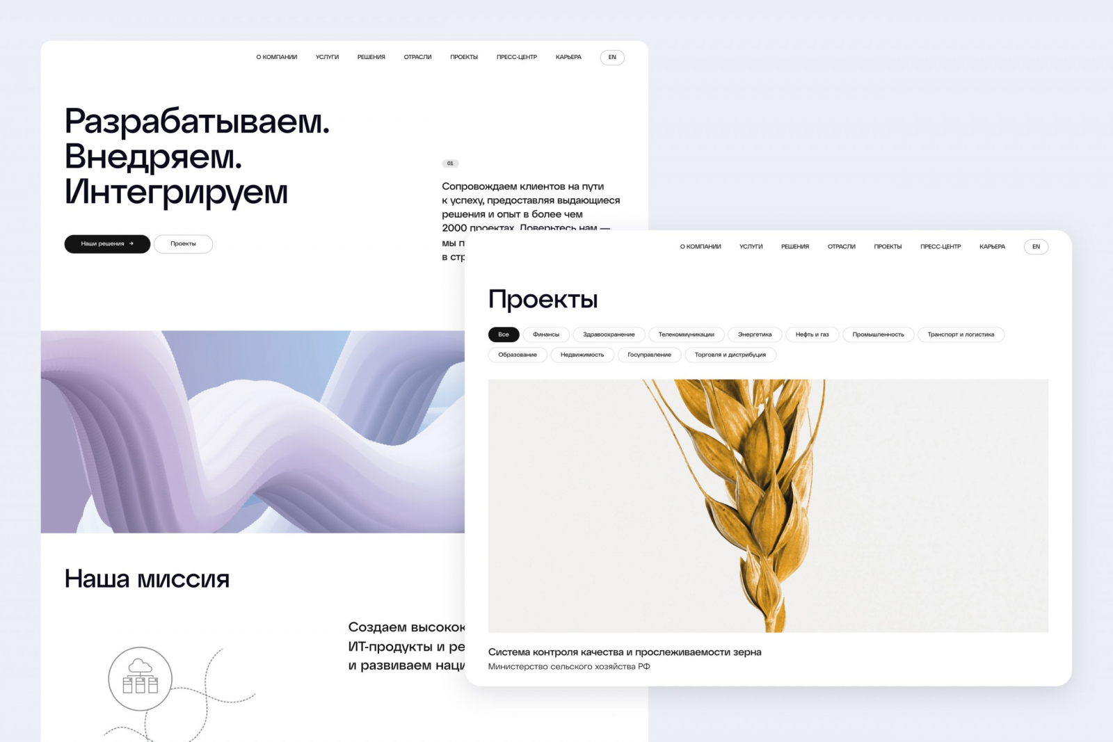 Для раздела «Проекты» мы создали удобную навигацию с системой фильтров по отраслям, позволяющей пользователям быстро находить нужные кейсы по направлениям, таким как финансы, промышленность, образование и транспорт. Акцент сделали на крупных иллюстрациях. Предполагается что там будут современные минималистичные 3D анимации на тему кейса.