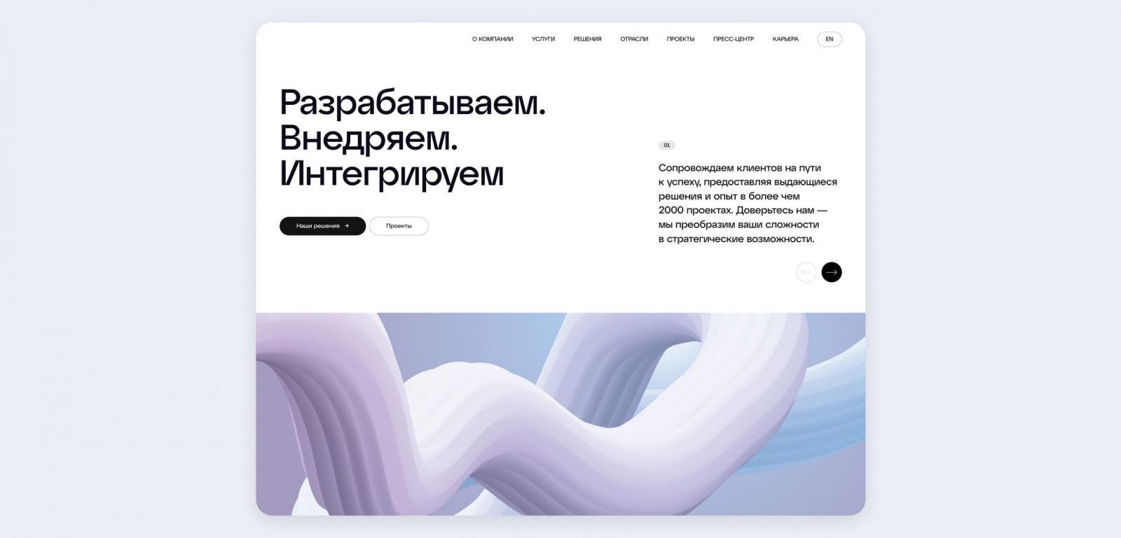 На первом экране добавили емкий лозунг: «Разрабатываем. Внедряем. Интегрируем» и добавили «карусель» с текстом, рассказывающим о деятельности компании.