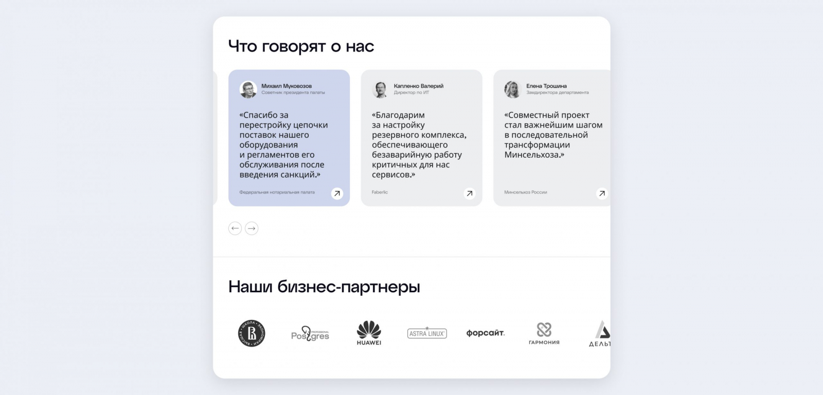 Рассказали о миссии и услугах, подкрепили доверие пользователей отзывами и логотипами партнеров.