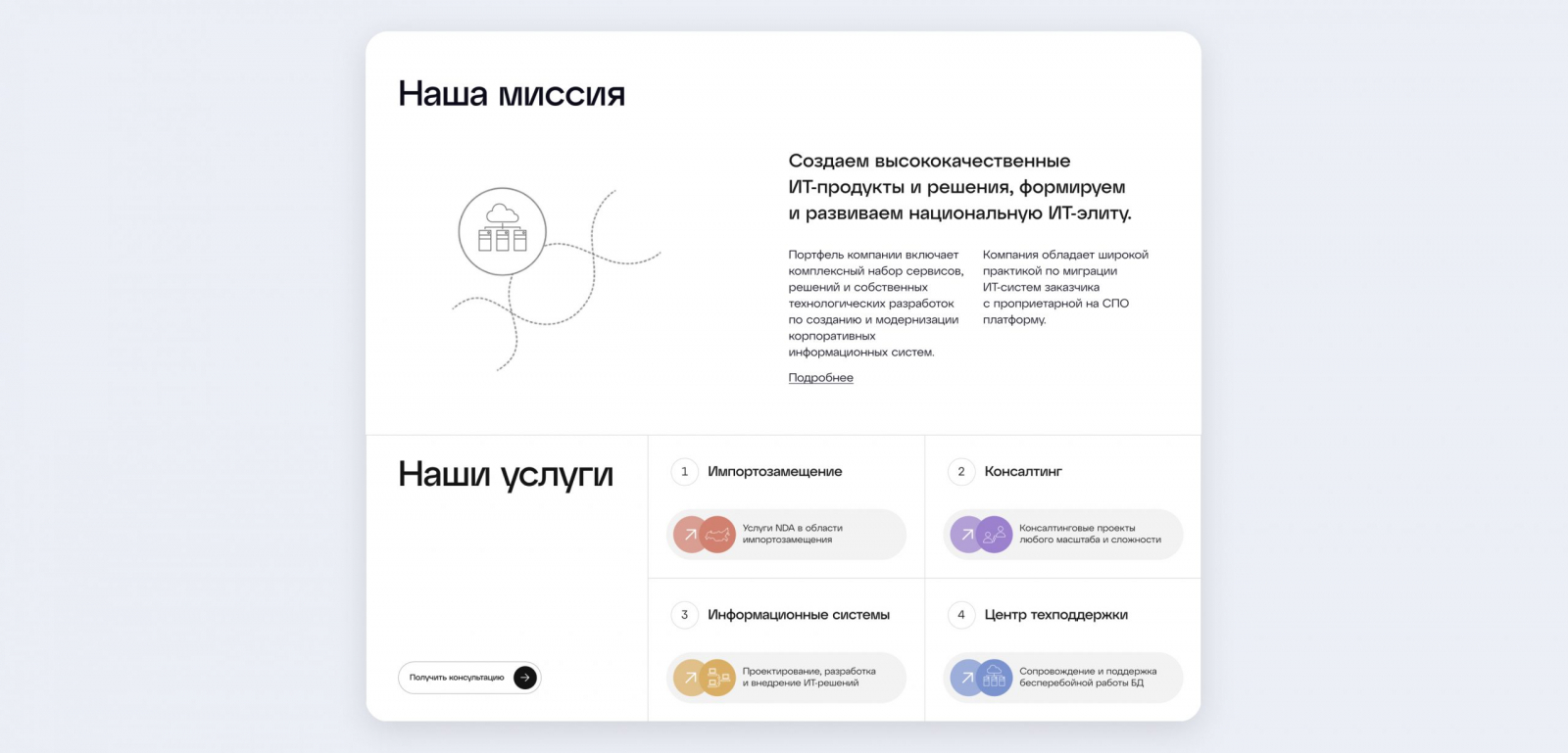 В рамках редизайна сайта мы переработали структуру страниц: добавили интуитивные карточки с услугами, которые выделены цветом и иконками для быстрого поиска информации. Также добавили современные минималистичные иллюстрации на главную страницу и страницу с кейсами.