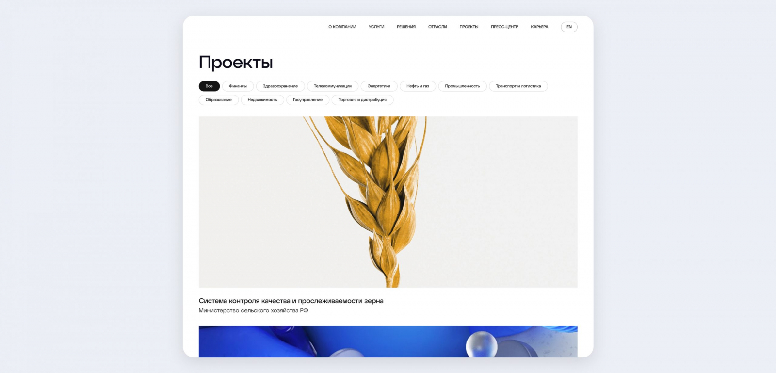 Чтобы акцентировать внимание на решениях компании, каждому проекту были добавлены крупные, привлекательные изображения. Они отражают суть и результаты работы компании, будь то визуальные символы для сельскохозяйственной отрасли или технологичные элементы для финансового сектора.
