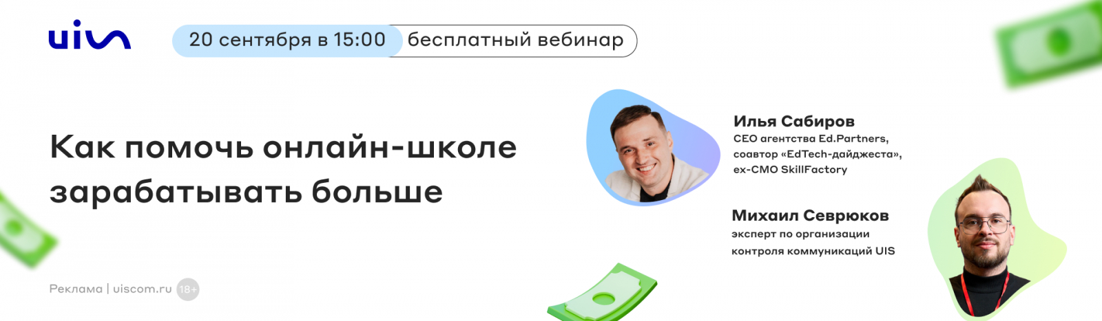 20 сентября в 15:00 (МСК) UIS совместно с маркетинговым агентством Ed.Partners проведут бесплатный вебинар на тему «Как помочь онлайн-школе зарабатывать больше». Эксперты расскажут, как грамотно выстроить работу отделов продаж и маркетинга в сфере онлайн-образования.