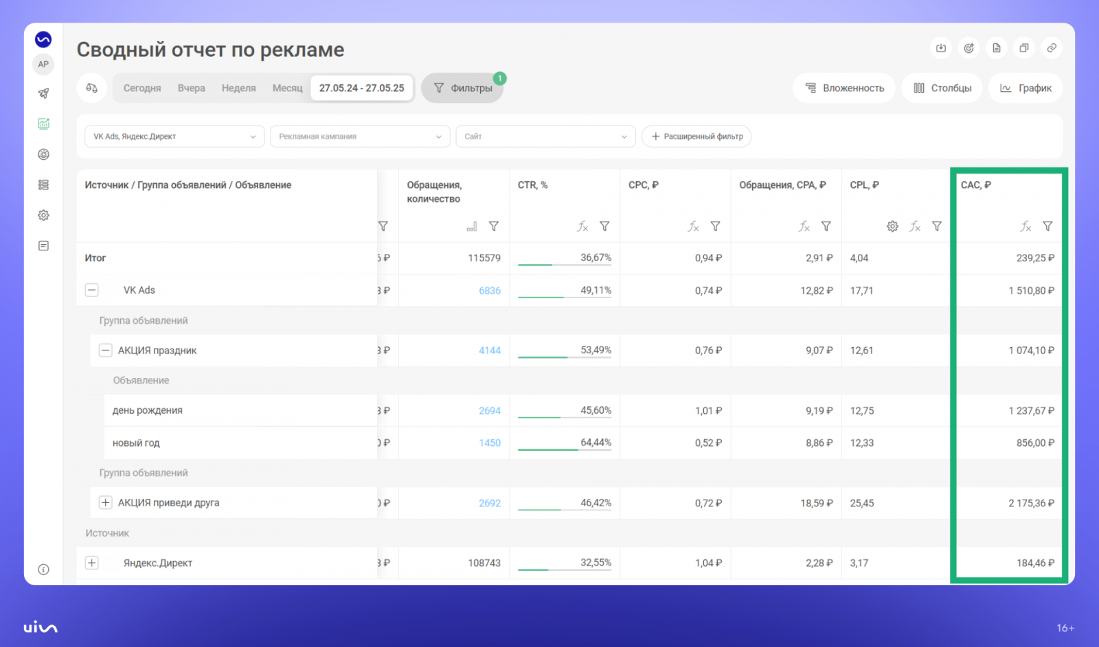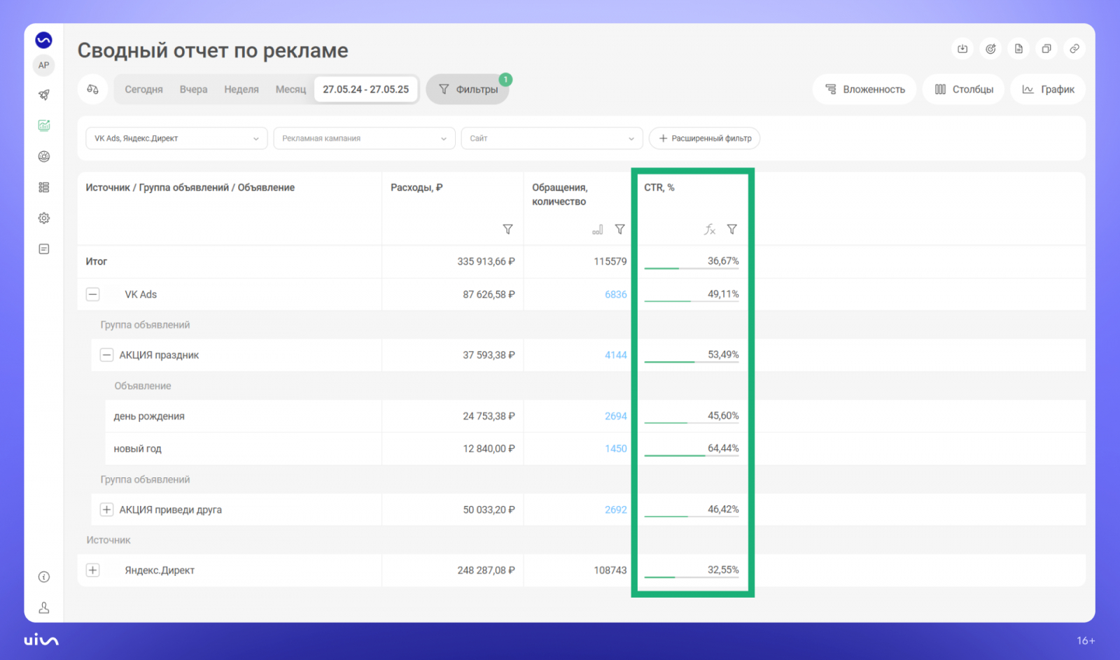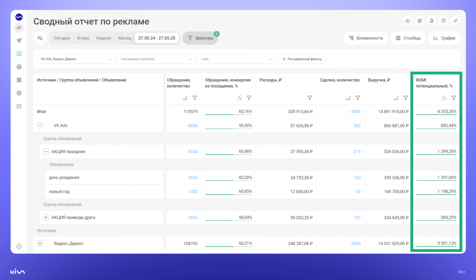 Чтобы избегать ошибок и эффективно управлять маркетингом, важно объединить все данные в одной системе, например UIS. Тогда данные из рекламных кабинетов, CRM и каналов коммуникаций будут автоматически собираться в едином отчете аналитики рекламы. В нем показаны: