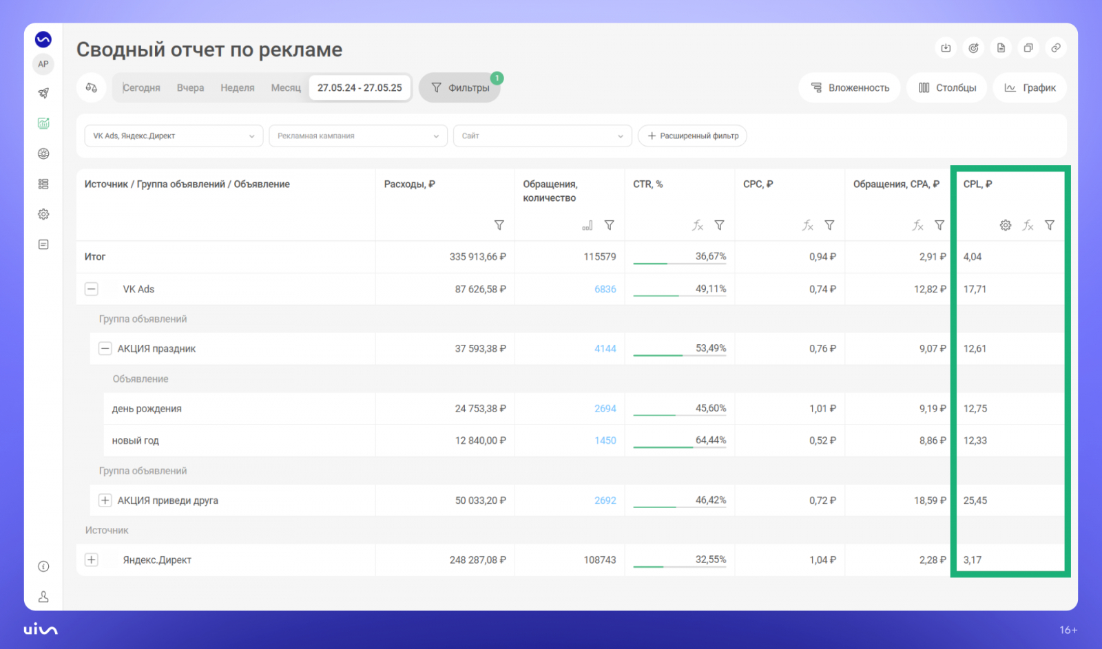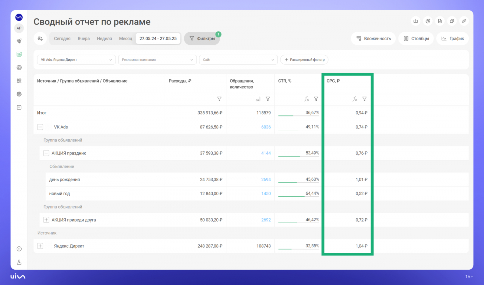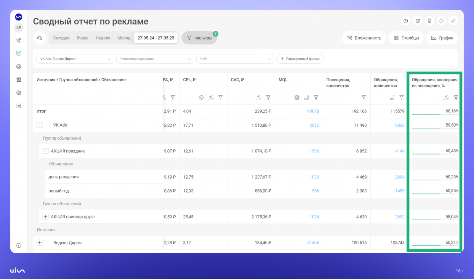 Чтобы избегать ошибок и эффективно управлять маркетингом, важно объединить все данные в одной системе, например UIS. Тогда данные из рекламных кабинетов, CRM и каналов коммуникаций будут автоматически собираться в едином отчете аналитики рекламы. В нем показаны: