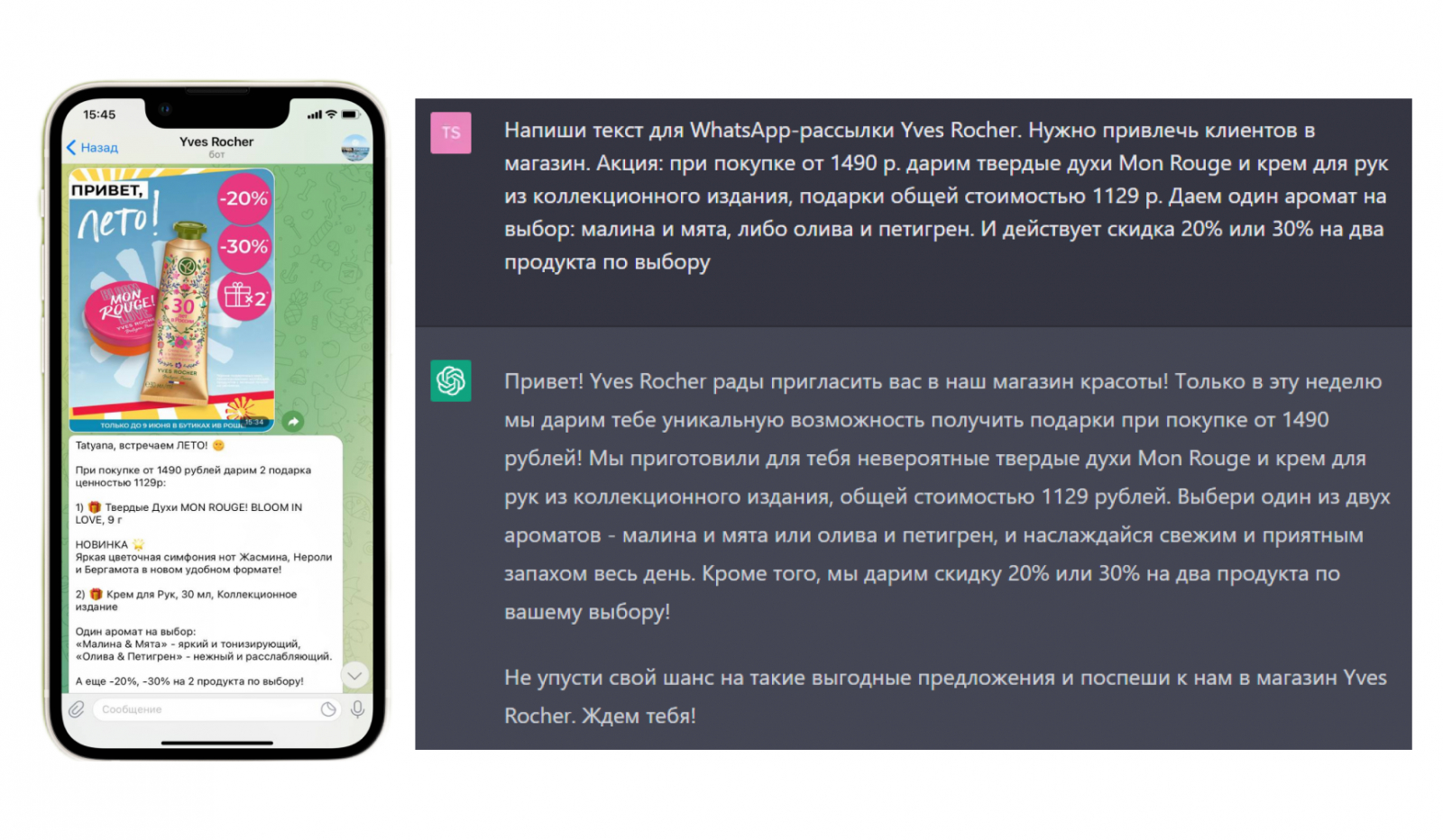 Мы решили сравнить тексты рассылок на примере мессенджер-кампании Yves Rocher. Подписчиковнужно было подтолкнуть к покупке, используя предложение: “Купи товары на сумму от 1490 рублей и получи в подарок твердые духи и крем для рук”.