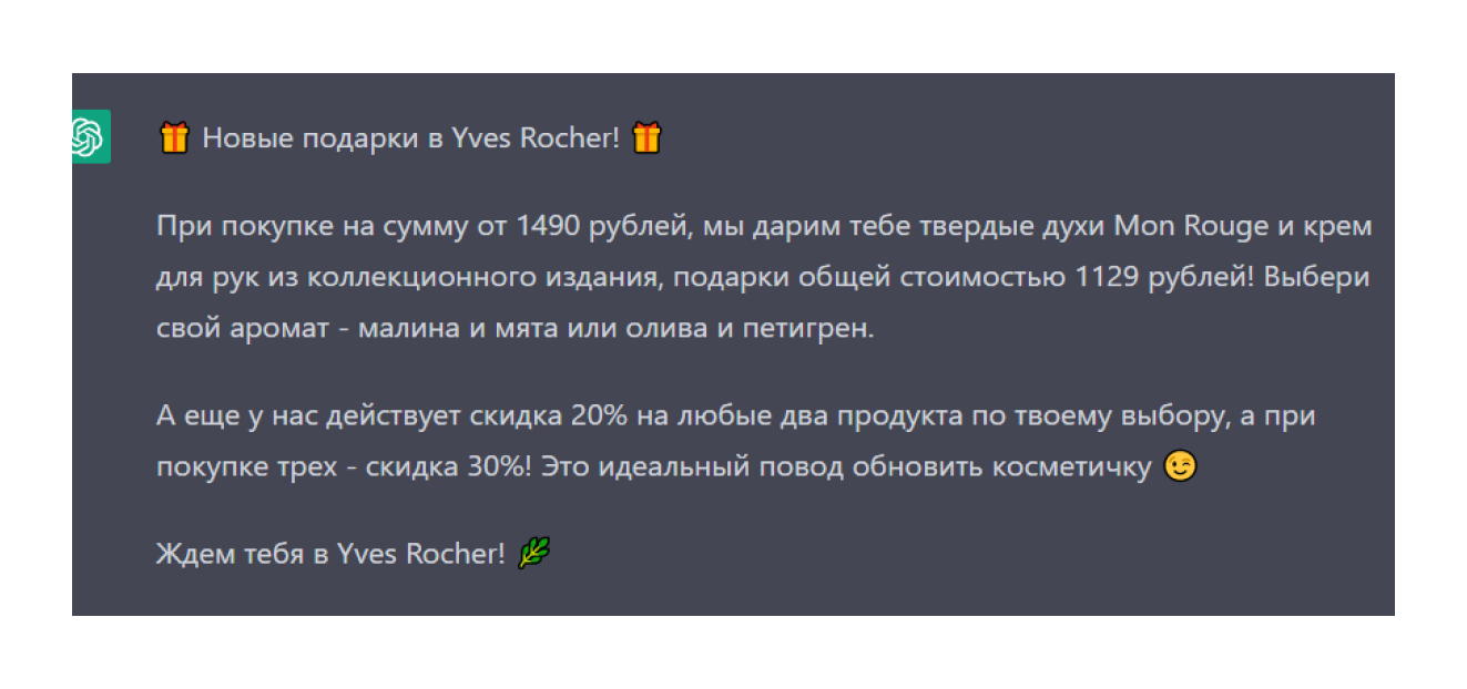 Мы перепробовали разные варианты запросов: рассказывали нейронке о контексте и целях рассылки, о компании Yves Rocher, просили писать конкретнее и короче, но все равно получали ерунду. Наконец, выкинули все остальные советы и попросили добавить эмодзи. И внезапно все стало гораздо лучше: