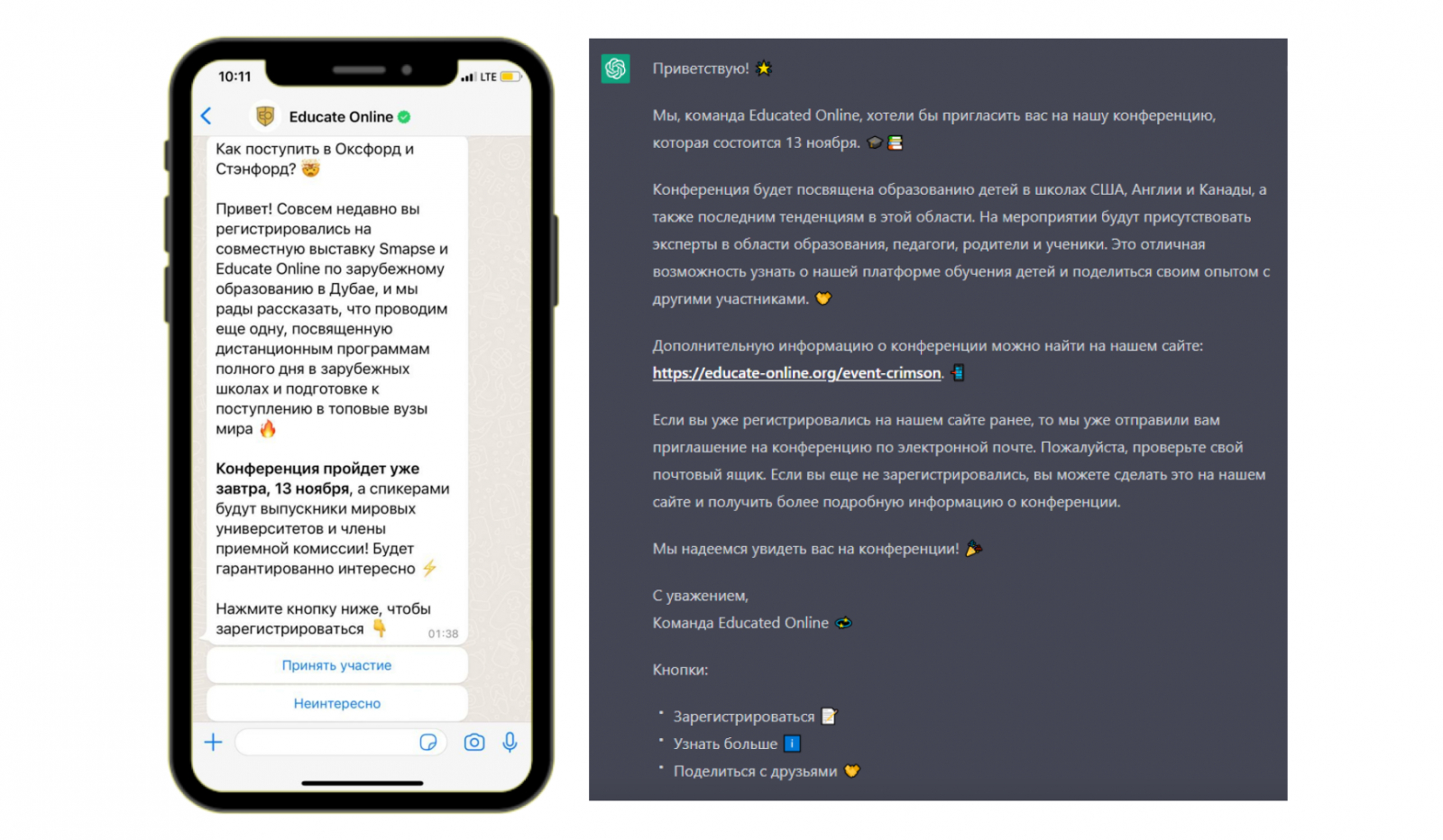 Мы решили проверить, сможет ли ChatGPT позвать аудиторию на онлайн-ивент, опираясь на информацию по ссылке. За основу взяли рассылку от Educated Online, это платформа для обучения детей в школах США, Англии и Канады. Цель — привести людей на бесплатную конференцию по образованию в Дубае.