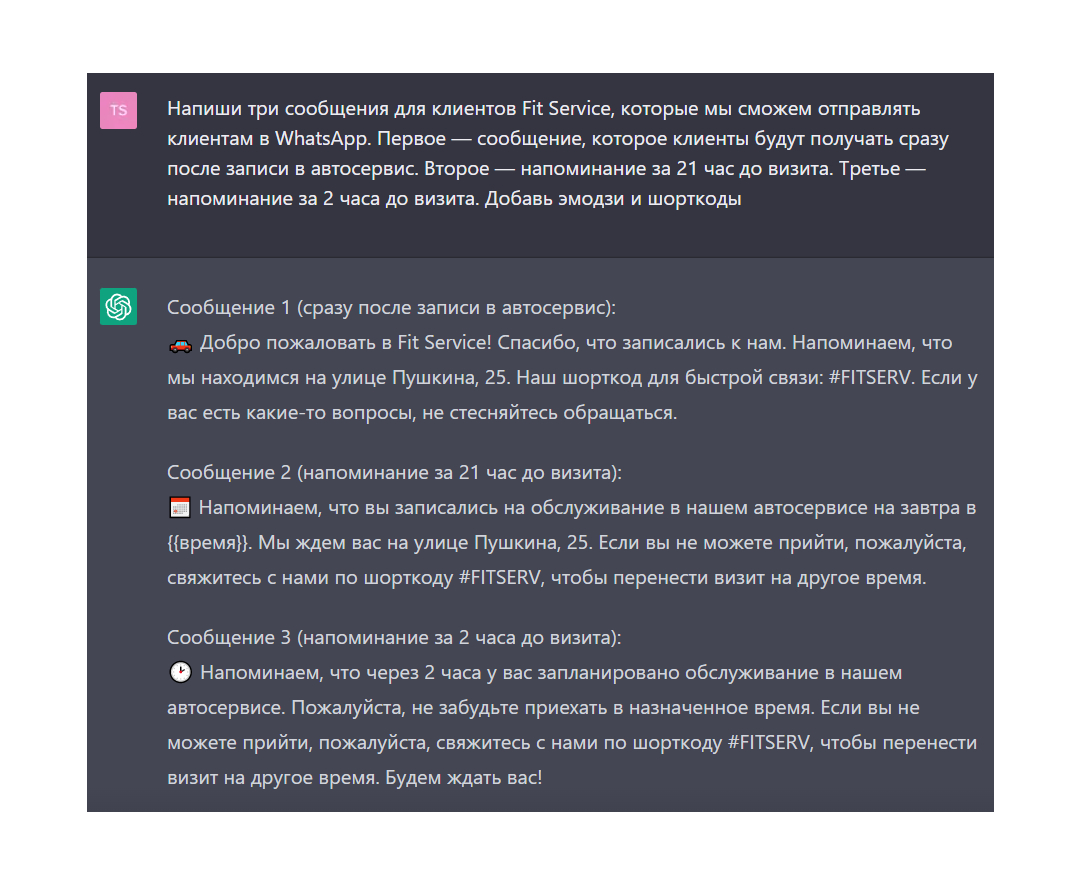 Мы попросили ChatGPT написать аналогичные сообщения. Сначала нейросеть не поняла, что в сообщения нужно добавить информацию о времени записи и адресе автоцентра. Так что мы попросили добавить эмодзи и шорткоды. Вот что получилось в итоге: