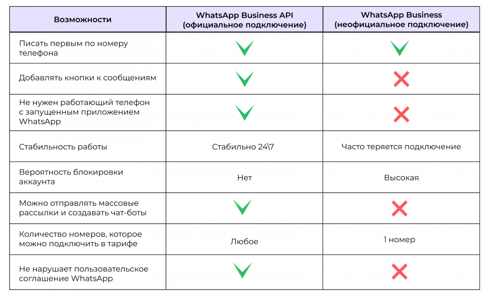 Официальный WhatsApp (WhatsApp Business API)— легальный способ подключения к возможностям автоматизации WhatsApp. Вы можете отправлять рассылки, запускать чат-ботов и общаться с клиентами без риска блокировки. Вы не нарушаете закон и правила предоставления услуг мессенджера — используете инструмент, который предоставляет WhatsApp бизнесу для этих задач.