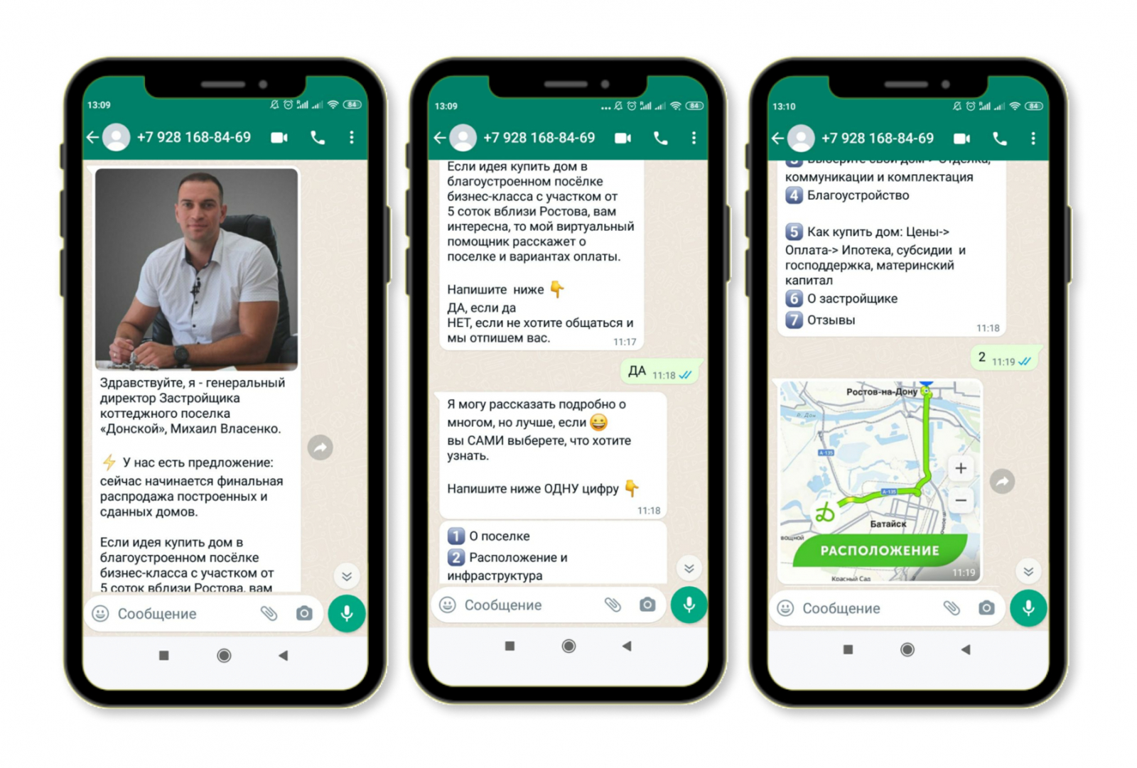 С помощью платформы, к которой подключен WhatsApp Business API, можно собрать чат-бота, который будет информировать клиентов об акциях или, примеру, помогать подобрать недвижимость на основании запроса клиента, а потом свяжет с менеджером.