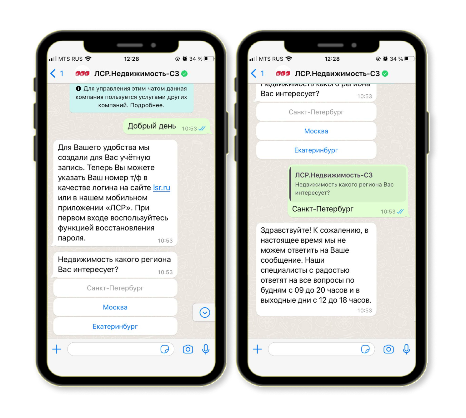 Пример WhatsApp-автоответчика от компании ЛСР.Недвижимость.