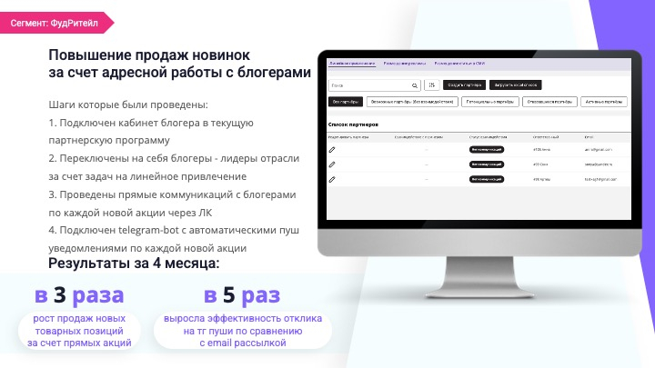 Мы уже видим, что такой механизм коммуникации в разы эффективнее, чем традиционные рассылки по электронной почте, которые были приняты в классическом СРА. Бот не только позволяет работать с большим количеством блогеров, коммуницировать с ними, уменьшая нагрузку на персональных менеджеров, он еще и повышает информированность партнеров о событиях, акциях и т. д.