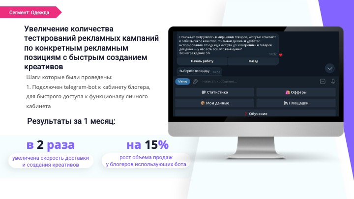 Большинство блогеров ушли от десктопов и ноутбуков и предпочитают пользоваться сервисами через телефон, в крайнем случае – через планшет. Поэтому наша платформа специально настроена таким образом, чтобы все процессы можно было настраивать с мобильного устройства, и это занимало как можно меньше времени. Одним из эффективных инструментов для этого является использование телеграм-ботов, с помощью которых можно коммуницировать с блогерами, и в том числе построить процесс по согласованию креативов, информированию о новых акциях и т.д.