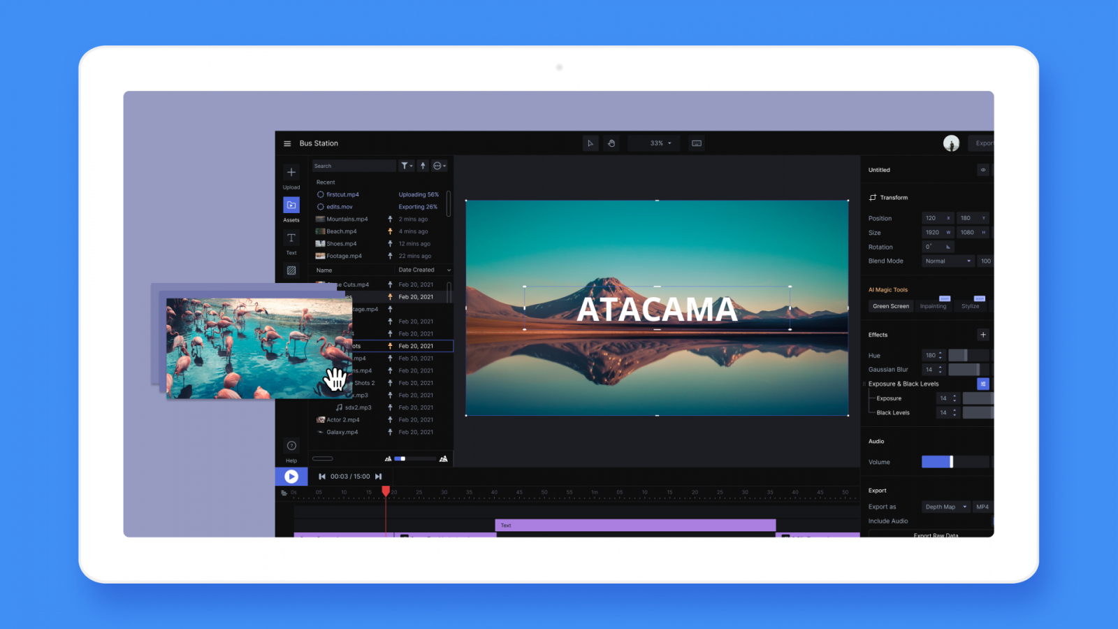 «Умная» альтернатива After Effects или Adobe Premier, которая не требует от пользователя специальных скиллов. Более 30 инструментов для работы с видео: удалить фон, motion capture, зеленый экран и даже создание 3D-изображений на основе текстовых запросов.