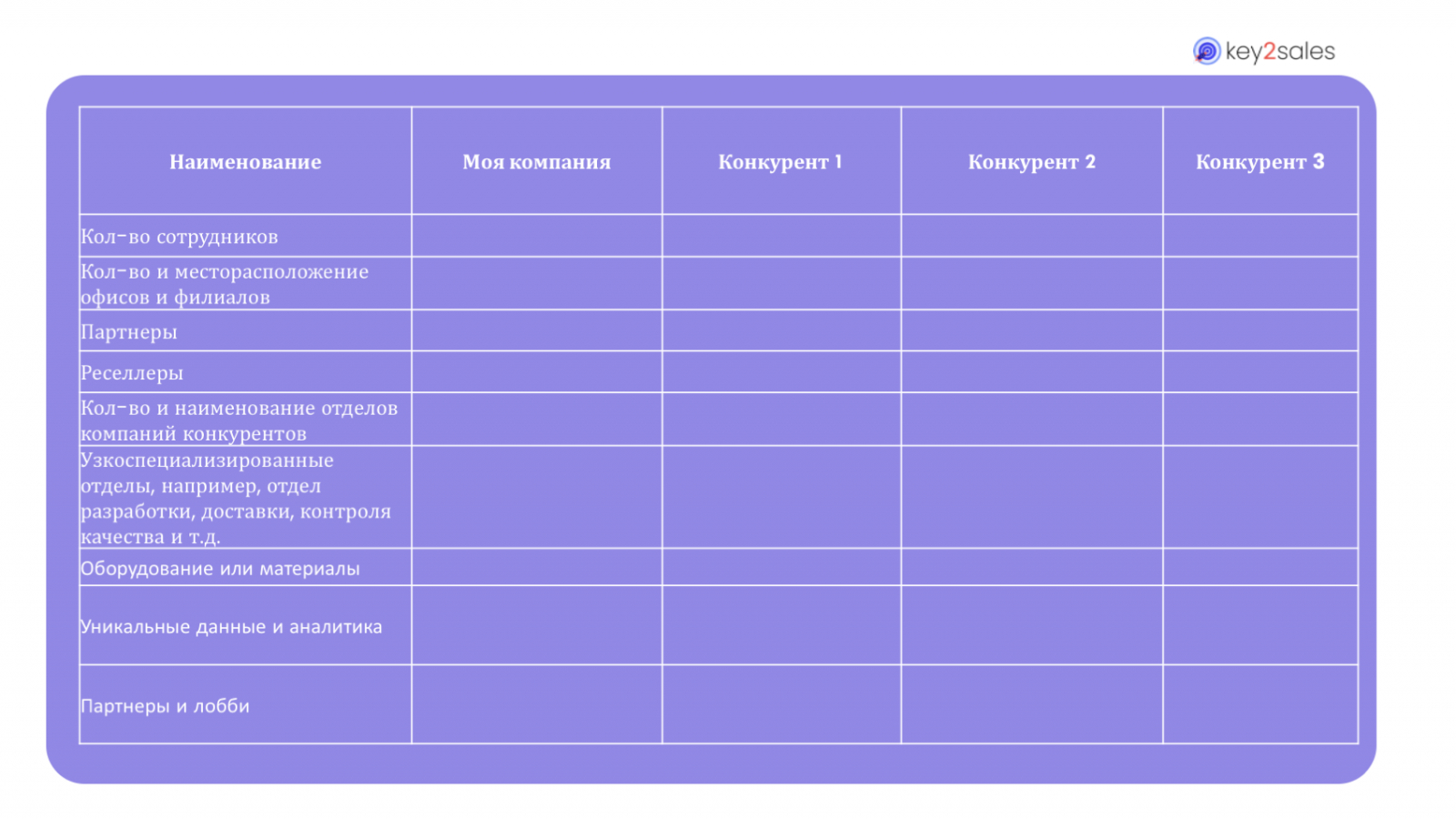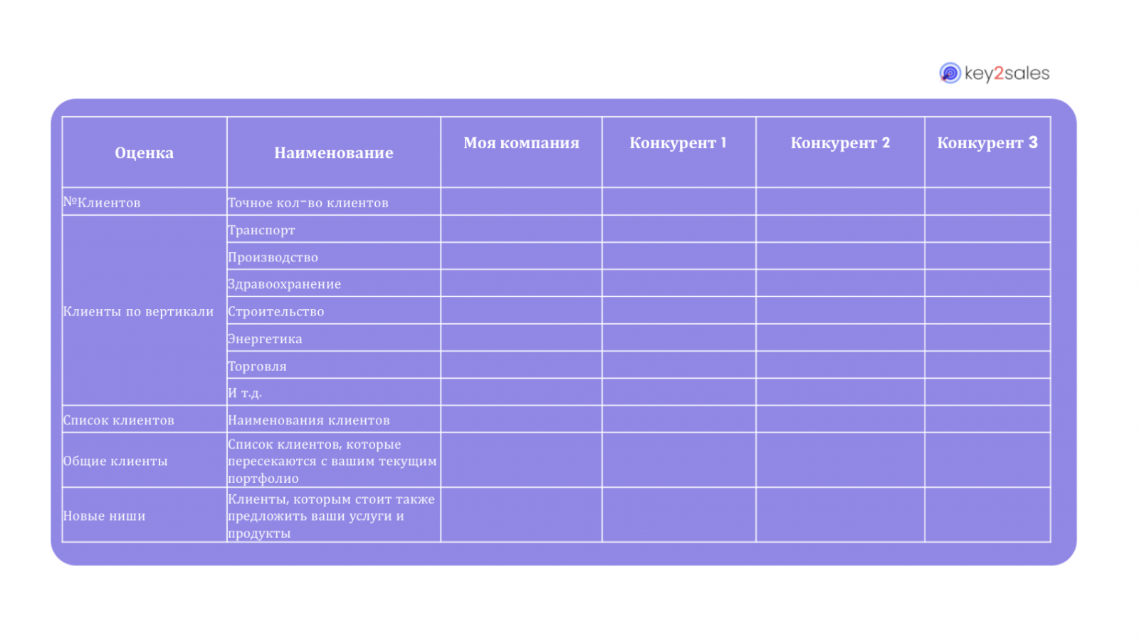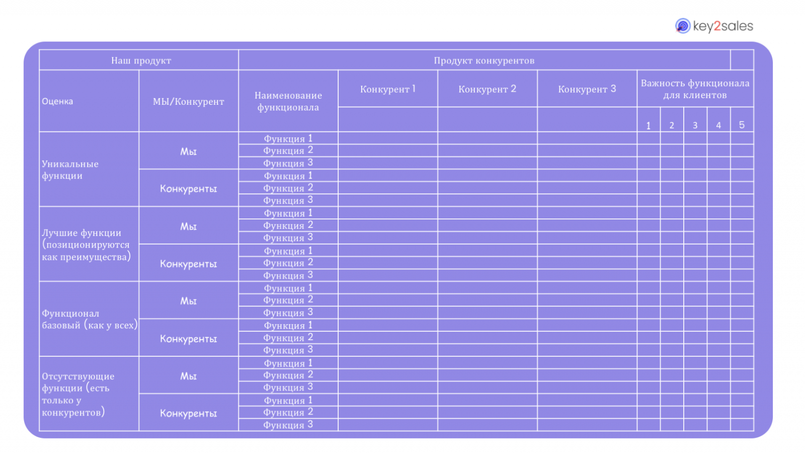 На шаблоне ниже представлены основные блоки сравнения продуктов конкурентов по функциональному признаку: