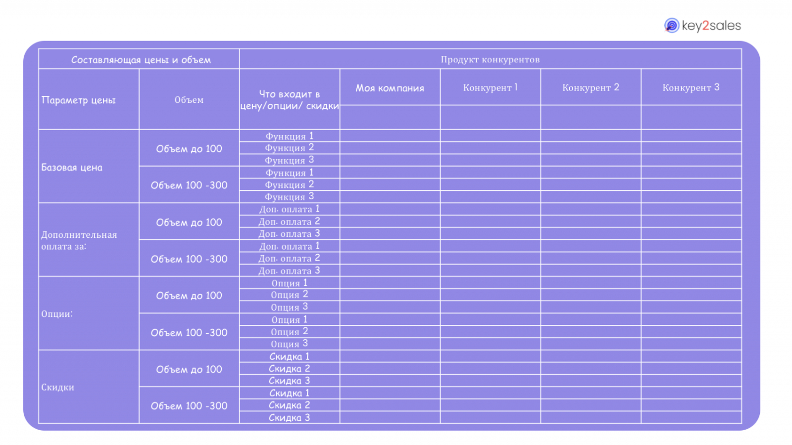ВАЖНО: Данная карта должна быть наполнена конкретным описанием функционала, цен, опций и скидок и является бесценным инструментом для продаж в коммуникации с клиентом.
