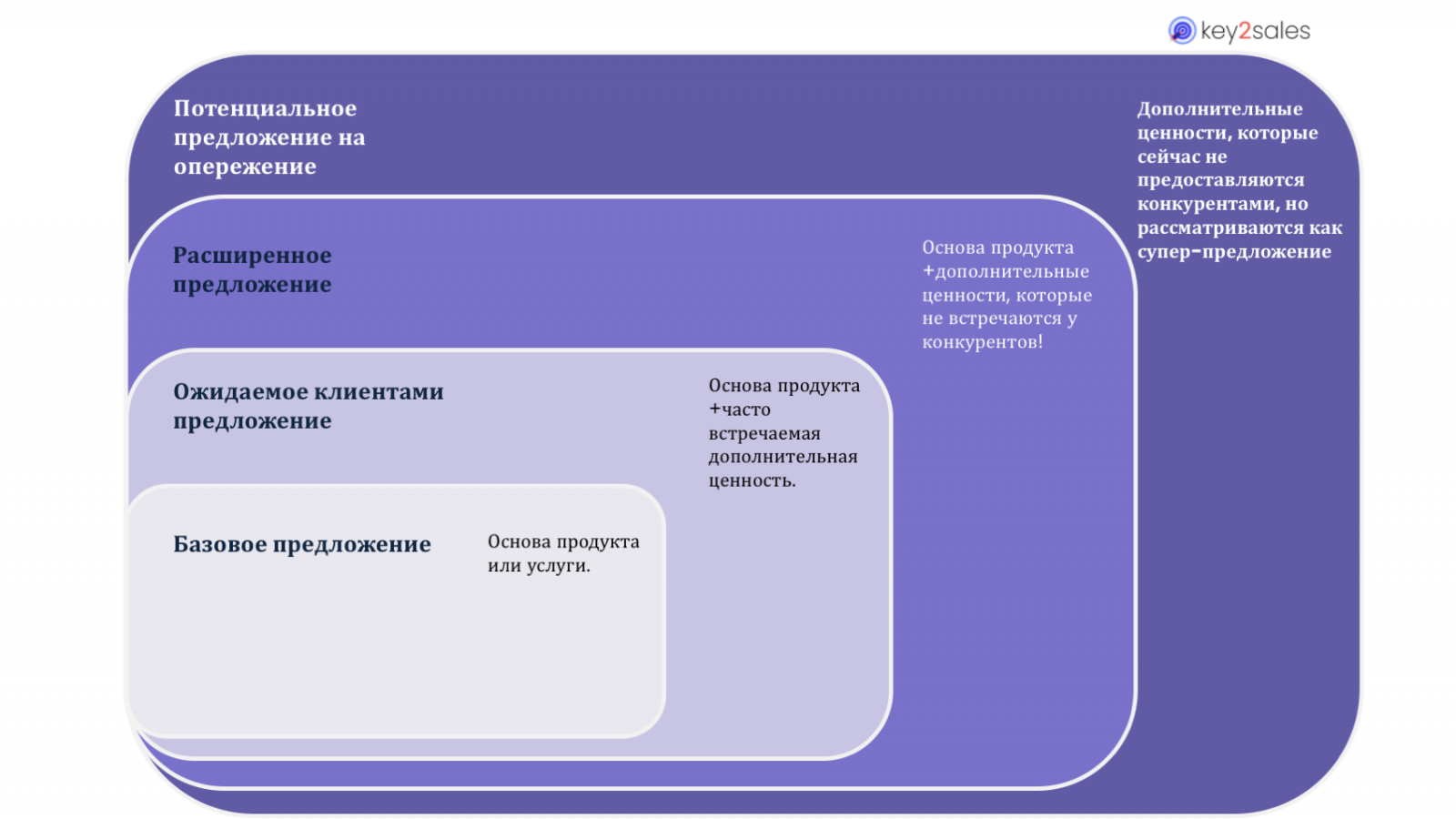 Ниже представлена структура такой карты: от базового продукта, функционал которого присутствует у всех конкурентов, до потенциального предложения, функции которого еще не предложены, однако будут рассмотрены как уникальное преимущество в будущем.