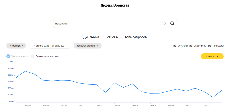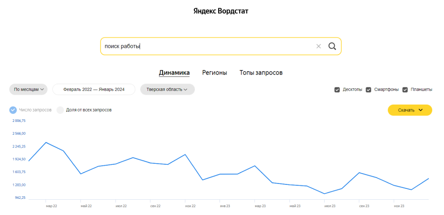 Клиент обратился к нам в декабре 2023 года — один из низких сезонов в рекрутинге. По статистике wordstat-2.yandex.ru интерес к вакансиям и поиску работы начинает снижается уже с конца ноября и возвращается только в январе.