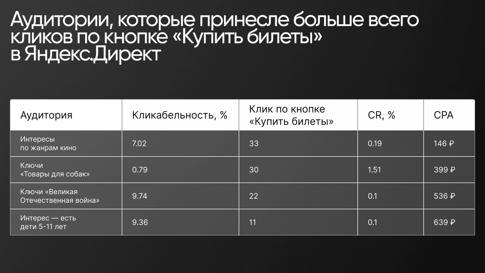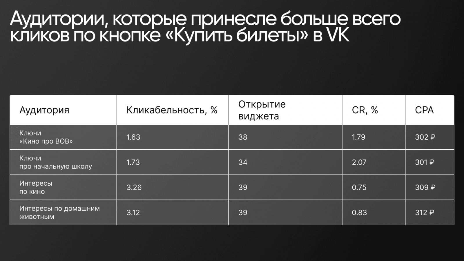 Поскольку не было точных инструментов для отслеживания конверсий в кинотеатрах, ориентировались на клики по кнопке «Купить билеты», просмотры трейлера и время, проведенное на сайте. Эти показатели позволяли нам отслеживать вовлеченность и оценивать эффективность рекламы.