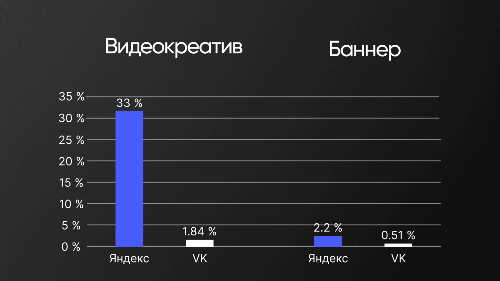 Формат видео-креатива показал отличные результаты — кликабельность до 33%. Видео привлекало больше внимания, чем статичные баннеры.
